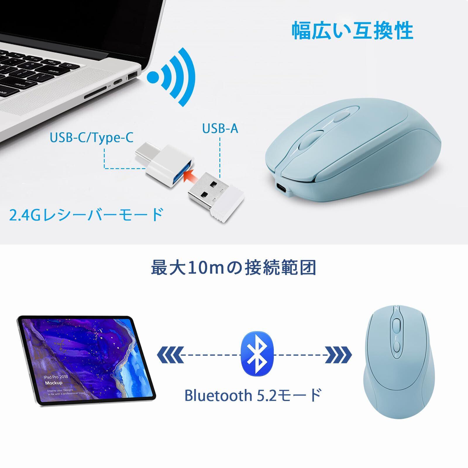 2WAY接続対応:Bluetooth接続とUSBレシーバー接続の2WAY仕様で、デバイスを切り替えてスムーズに使用可能な Bluetooth マウス です。 下部のワンボタンで切り替えでき、簡単的に操作できる。2.4GHz無線マウス はレシーバーを介してプラグアンドプレイします。接続が迅速で低遅延です。最大10mの伝送距離を実現しました。