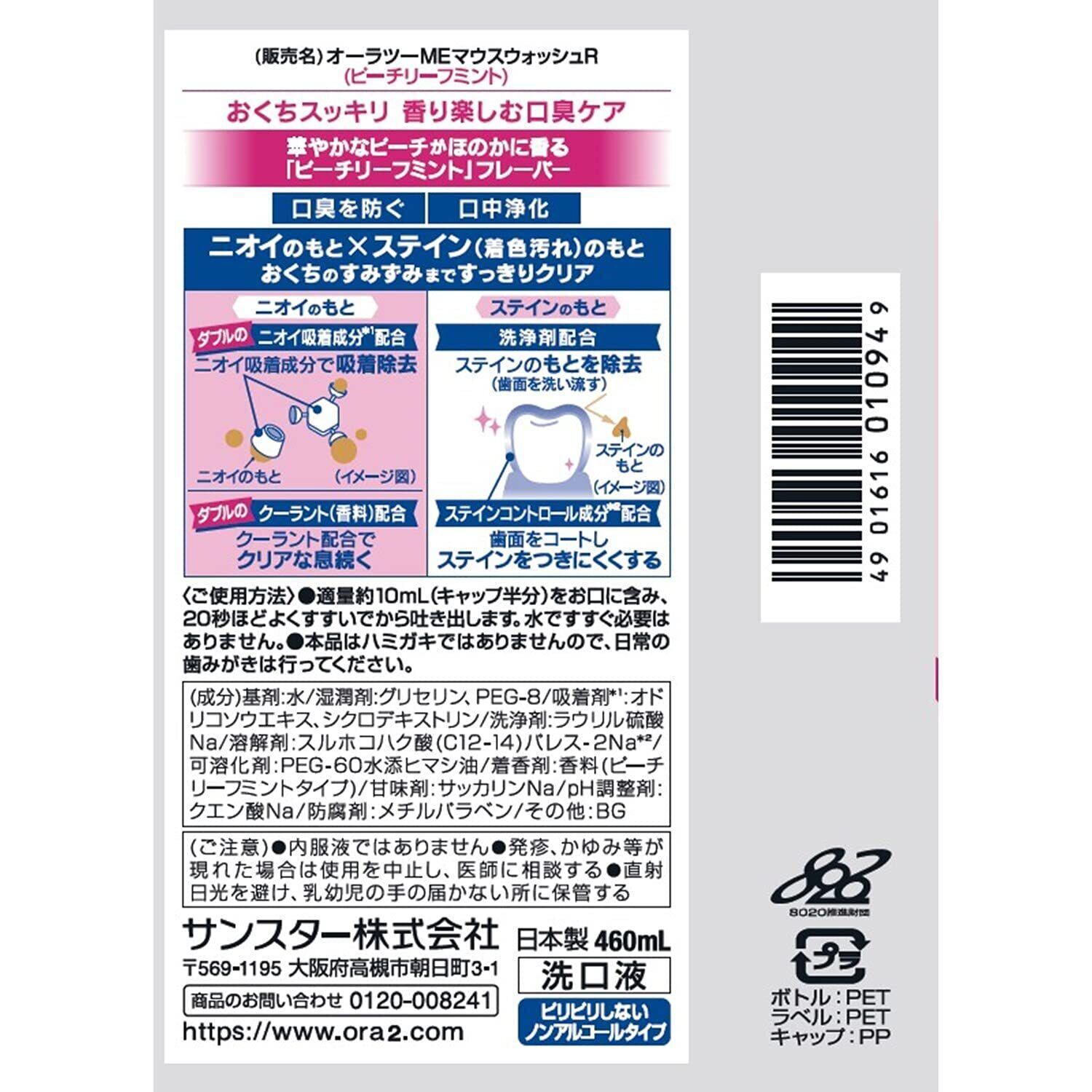 基剤:水/湿潤剤:グリセリン、PEG-8/吸着剤:オドリコソウエキス、シクロデキストリン/洗浄剤:ラウリル硫酸Na/溶解剤:スルホコハク酸(C12-14)パレス-2Na/可溶化剤:PEG-60水添ヒマシ油/着香剤:香料(ピーチリーフミントタイプ)/甘味剤:サッカリンNa/pH調整剤:クエン酸Na/防腐剤:メチルパラベン/その他:BG