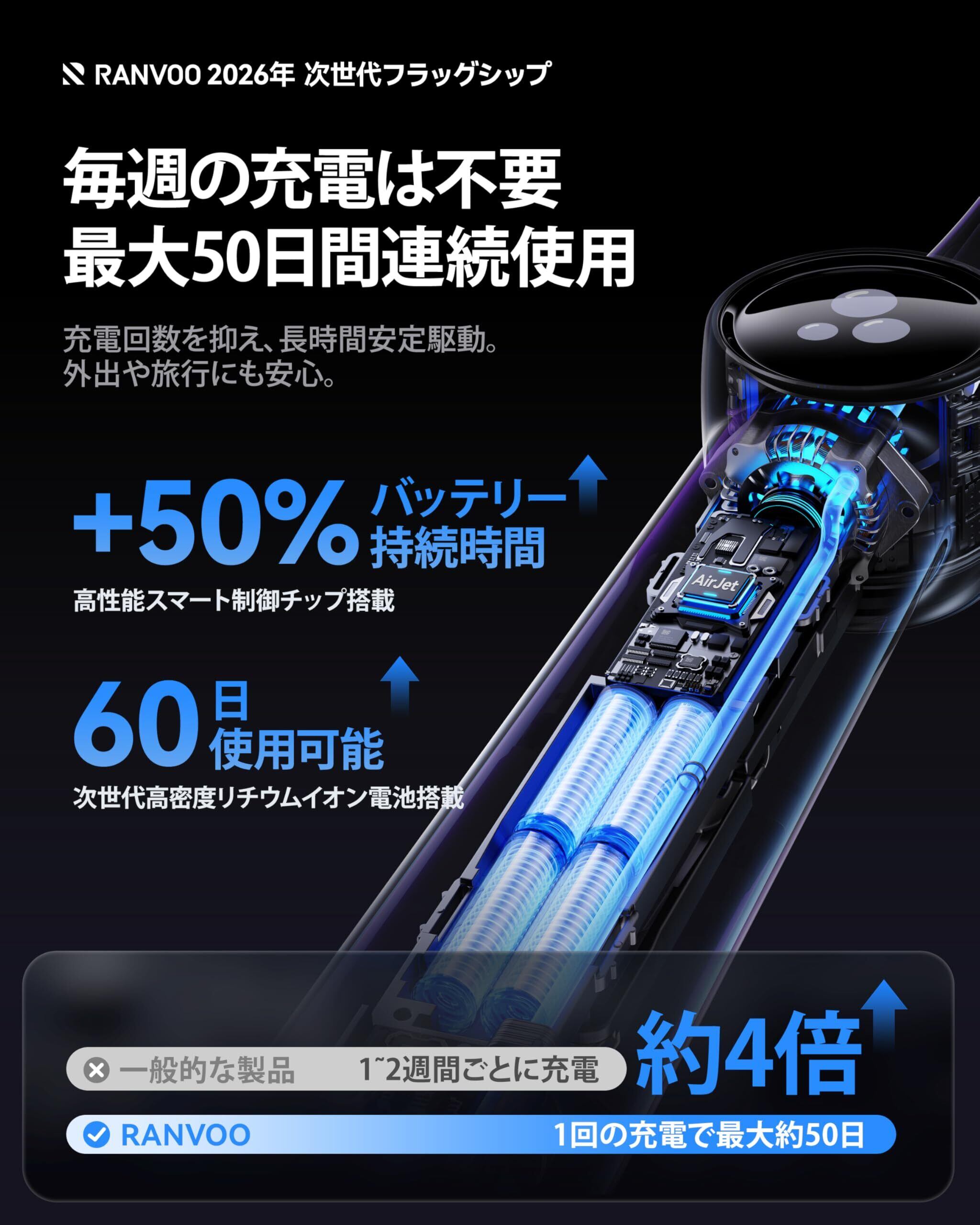 【2026次世代ジェット洗浄 歯間スッキリ制覇】 RANVOO新世代ジェット洗浄式電動歯ブラシ「AirJet X5」は、アップグレードされた三気筒ポンプと音波振動・気泡ジェットのダブルアクションにより、最大2.6m/秒の高速気流を実現。第2世代気泡技術を採用し、2.6倍増圧気泡チャンバーとCoanda気泡ブラシヘッドの組み合わせにより、毎分22万個の微細バブルが歯間の奥まで浸透。歯垢や食べかすなどの汚れを徹底的に除去し、虫歯や口臭の予防にも効果を発揮します。業界トップクラスの清掃力を誇り、歯垢除去率は最大99.89%。独立試験でもその性能が証明され、歯科専門家からも高い評価を獲得しています。コンパクトで奥歯まで届きやすいブラシヘッドと、歯ぐきにやさしい設計により、毎日のブラッシングでも快適かつ安心して使用可能。ご自宅にいながら、プロ仕様のディープクリーンと口腔ケアを手軽に実感できます。