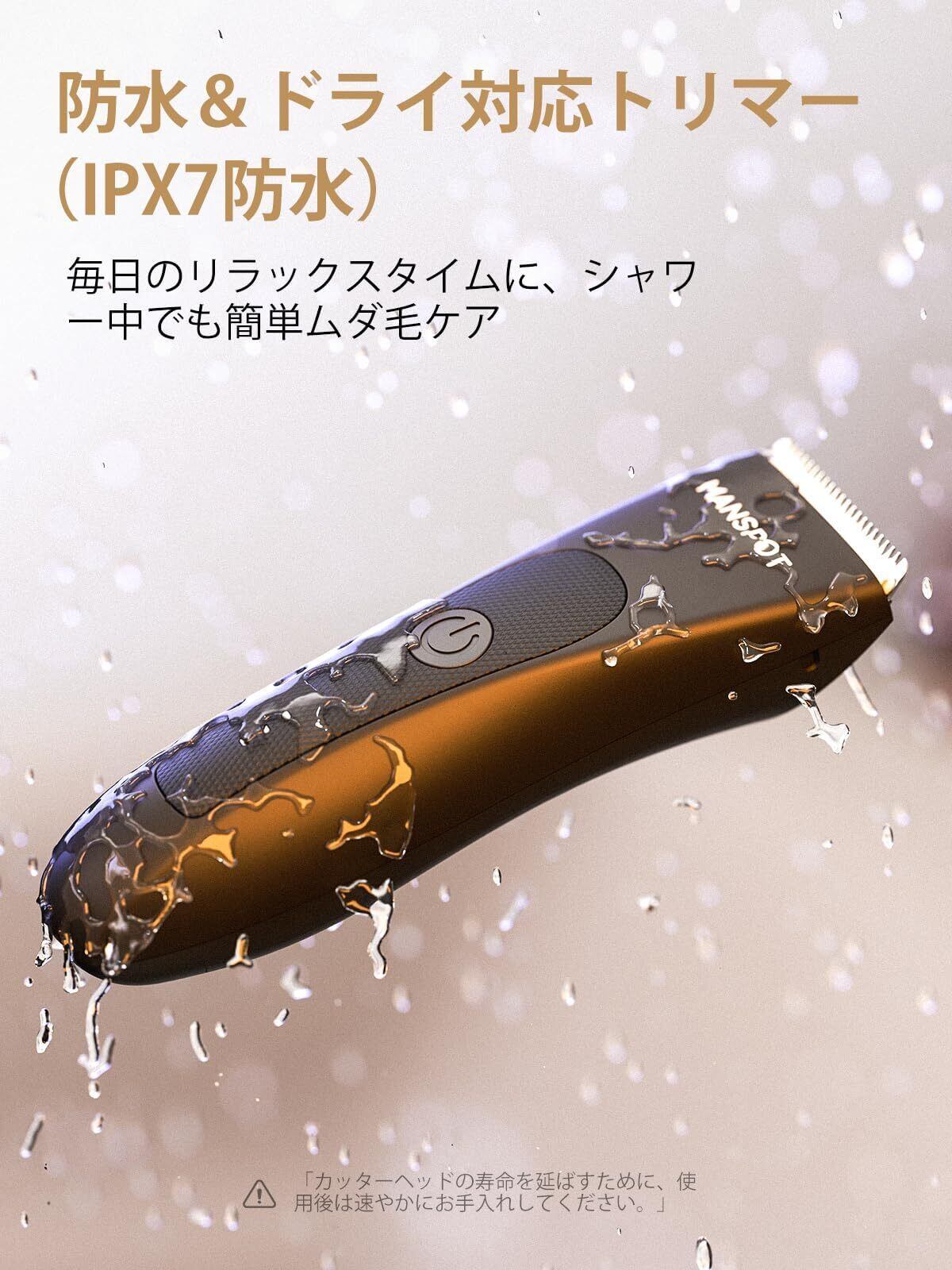 特徴 7000r/min 一掃式超効率, チクチクしない!セラミック刃, 人体工学設計!PP素材で長時間使いやすい, 多機能!防水仕様 IPX7・長寿命バッテリー, 専用 1.5mm 适配头!VIO完璧ケア