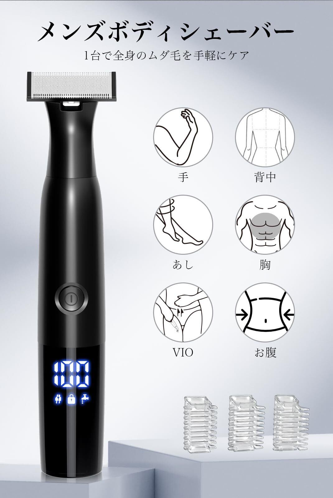ボディシェーバー VIO シェーバー メンズ 残量表示 自動研磨 防水仕様 USB-C充電 むだげ処理 脇 腕 足 デリケートゾーン 全身適用 男性用 水洗い可 お風呂剃り可 リミットコーム付き