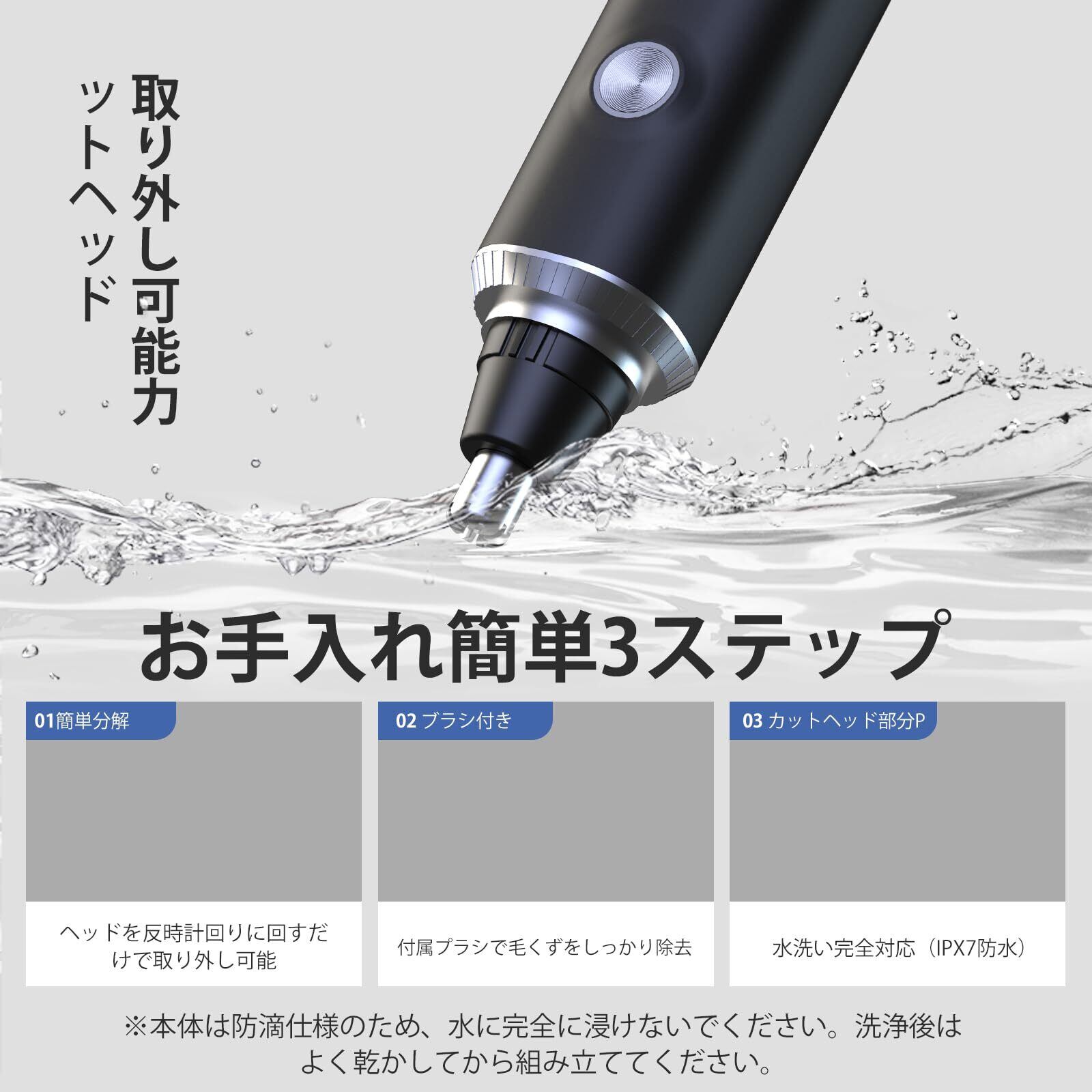 【IPX7防水&刃外せます】電動鼻毛カッターはIPX7防水仕様で、安心して水洗いができます(充電ポート除く)。ヘッド内部の刃も取り外して、付属のブラシで掃除できるので、カスや雑菌の繁殖を防止することができ、いつも清潔に保つことができます(本体は水洗いできますが、水に浸さないでください)