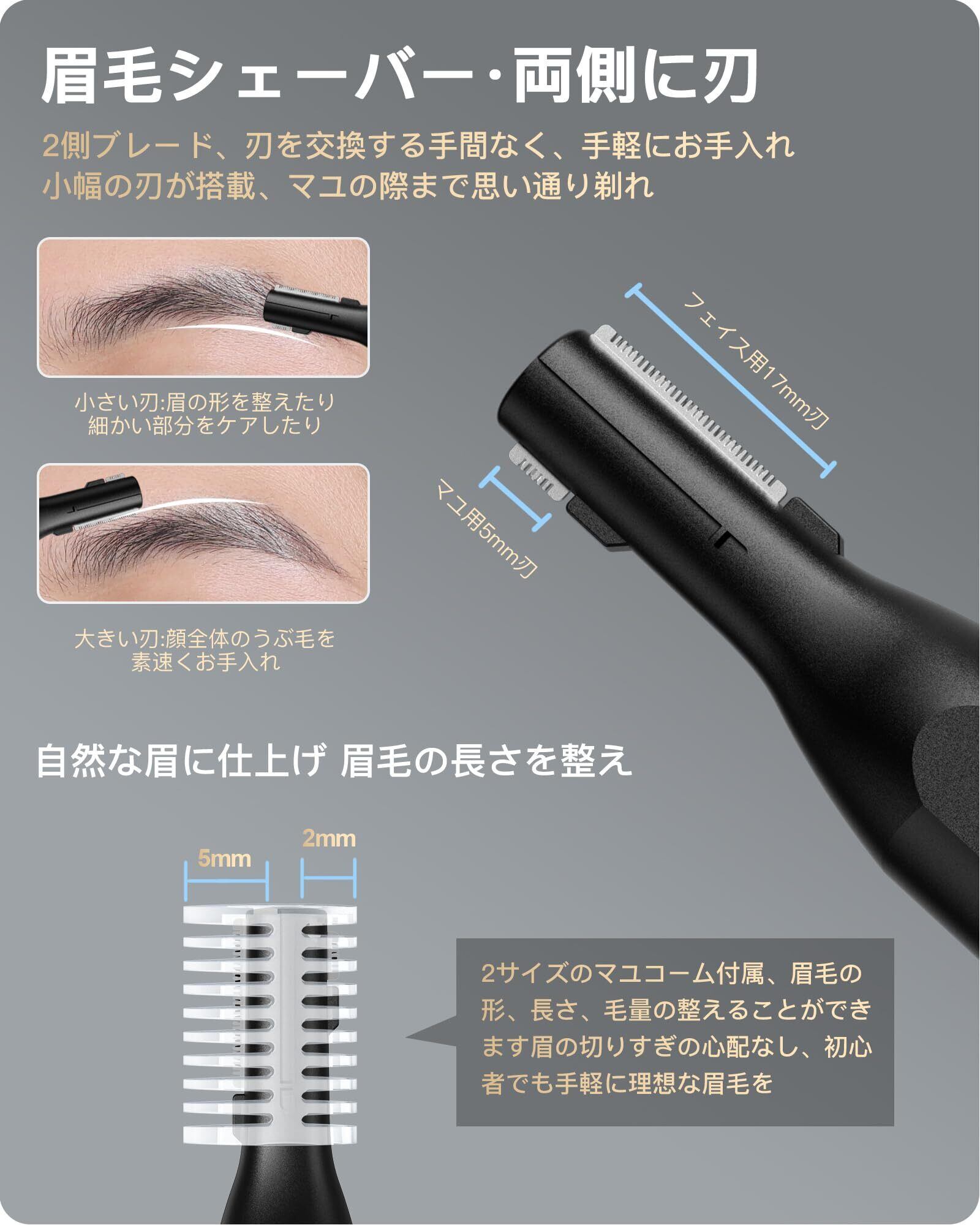 【強力モーター&使いやすい】フェイスシェーバー メンズは良質な精密ステンレス鋼刃と良質な構造を採用し、両刃360°回転システムを内蔵し、滑らかなシェービング効菓を提供し、苦痛と不快な引っ張りがない。眉毛カッターには10000回転の高速回転電機が搭載されており、顔との接触が快適で滑らかで、髪ともみあげを自動的に捕捉でき、鋭利で耐久性があり、清潔で爽やかです。眉毛 メンズの初心者から、こだわりのある美容マニアまで、幅広い方におすすめ!