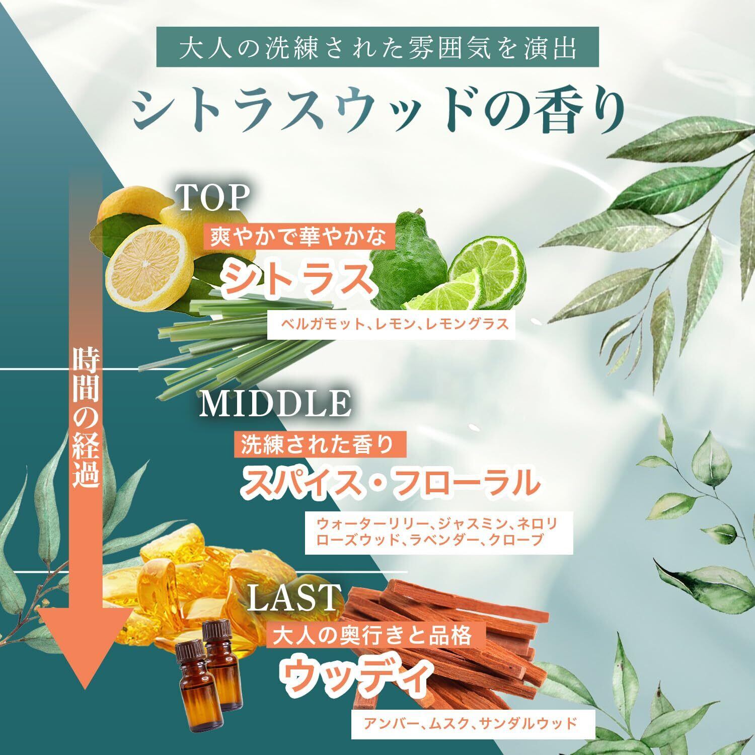 【シトラスウッドの上品な印象】 爽やかなシトラスから、落ち着いたウッディへと変化する香水調のシトラスウッド。 主張しすぎず、それでいて印象に残る香りで大人の洗練された雰囲気を演出します。