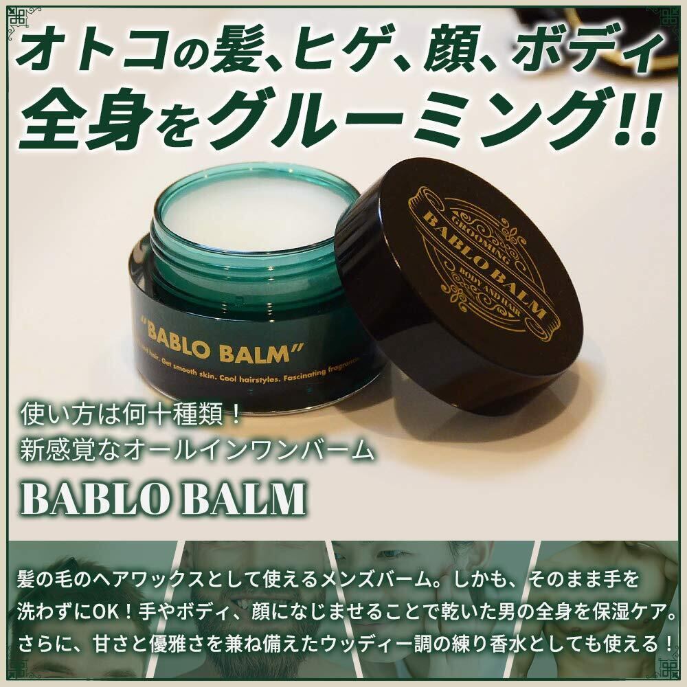 【髪、ヒゲ、顔、ボディなどの全身をトータルケア】 グルーミングブランド“BABLO”のメンズ用バーム。ヘアワックス(整髪料)、ヘアオイル、ヘアフレグランス、ハンドクリーム、ビアードオイル(髭剃り後の手入れ)、フェイスオイル、練り香水(アンバーウッディームスクの香り)、目元のケア、ボディモイスチャーオイル、リップバーム、ヘアトリートメント…など。使い方は何十種類。全身に使えるオールインワンバームです。