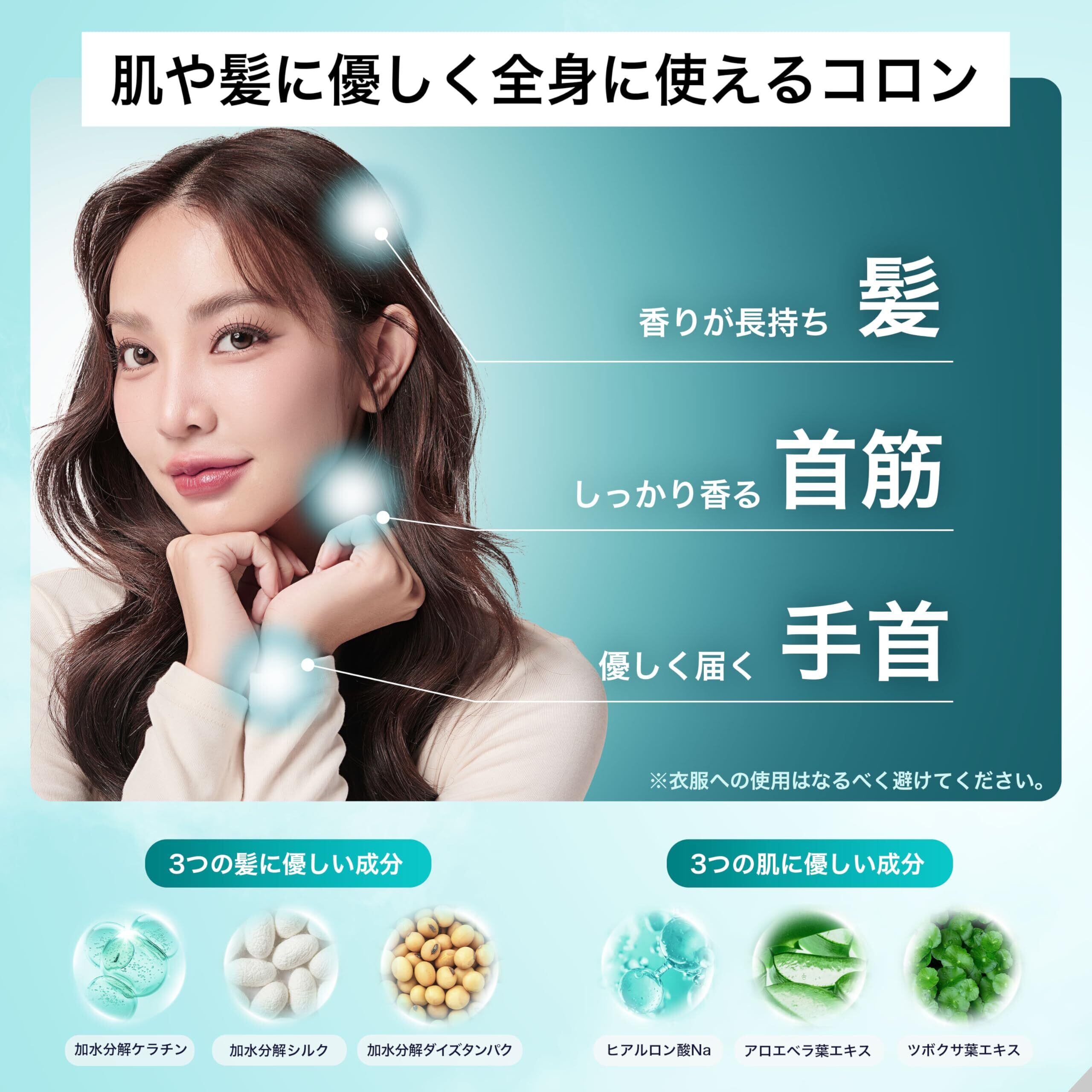 【使用方法】手首や首筋などお好みの局所に、肌から15cmほど離してスプレーしてください。「目安の使用量」は、ふんわり香らせたい場合は首筋や肌へ1〜2プッシュ、しっかり香らせたい場合は手首と首筋へ合計3〜4プッシュを目安に吹きかけてください。一度に多くスプレーするのではなく、数時間おきに1〜2プッシュ重ね付けすることで、香りを長時間楽しむことができます。