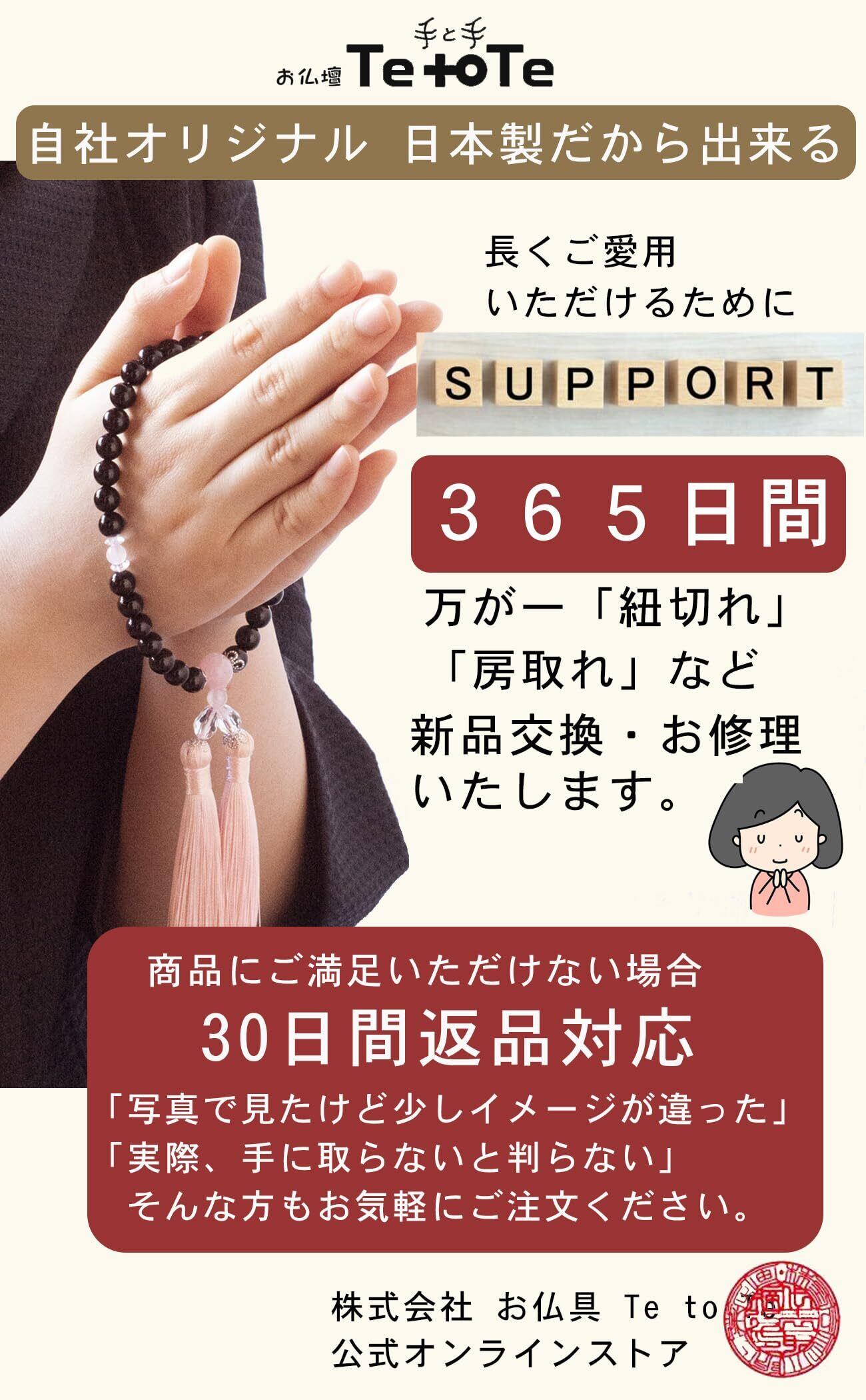 お客様にお届けする一つひとつのお数珠を、**「大切な方への真心の結晶」**として受け止め、心を込めて販売に取り組んでおります。 その一環として、当店でご購入いただいたお数珠には、1年間の書をお付けしております。末永く安心してご使用いただけるよう、品質とアフターケアの両面においても誠意を尽くしてまいります。
