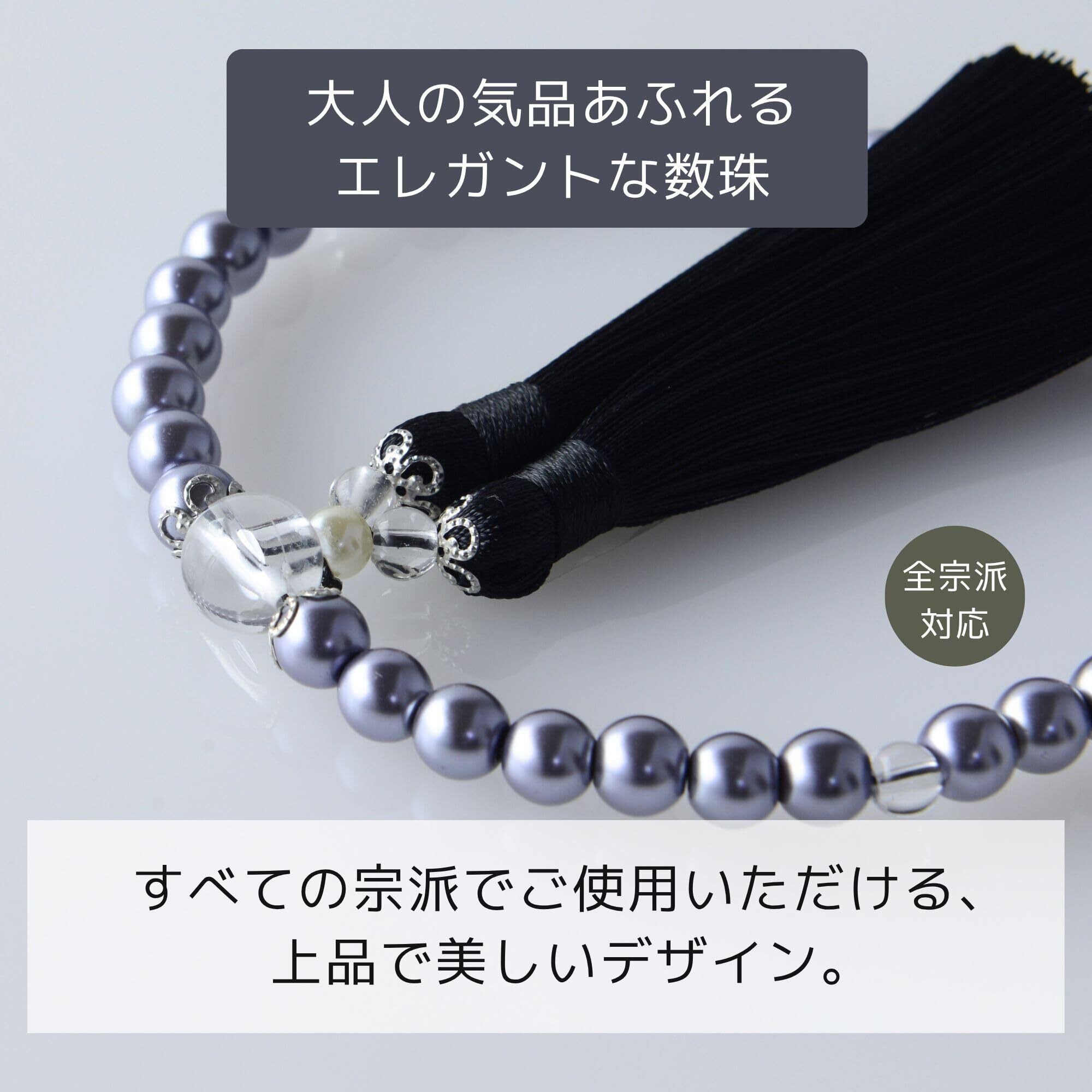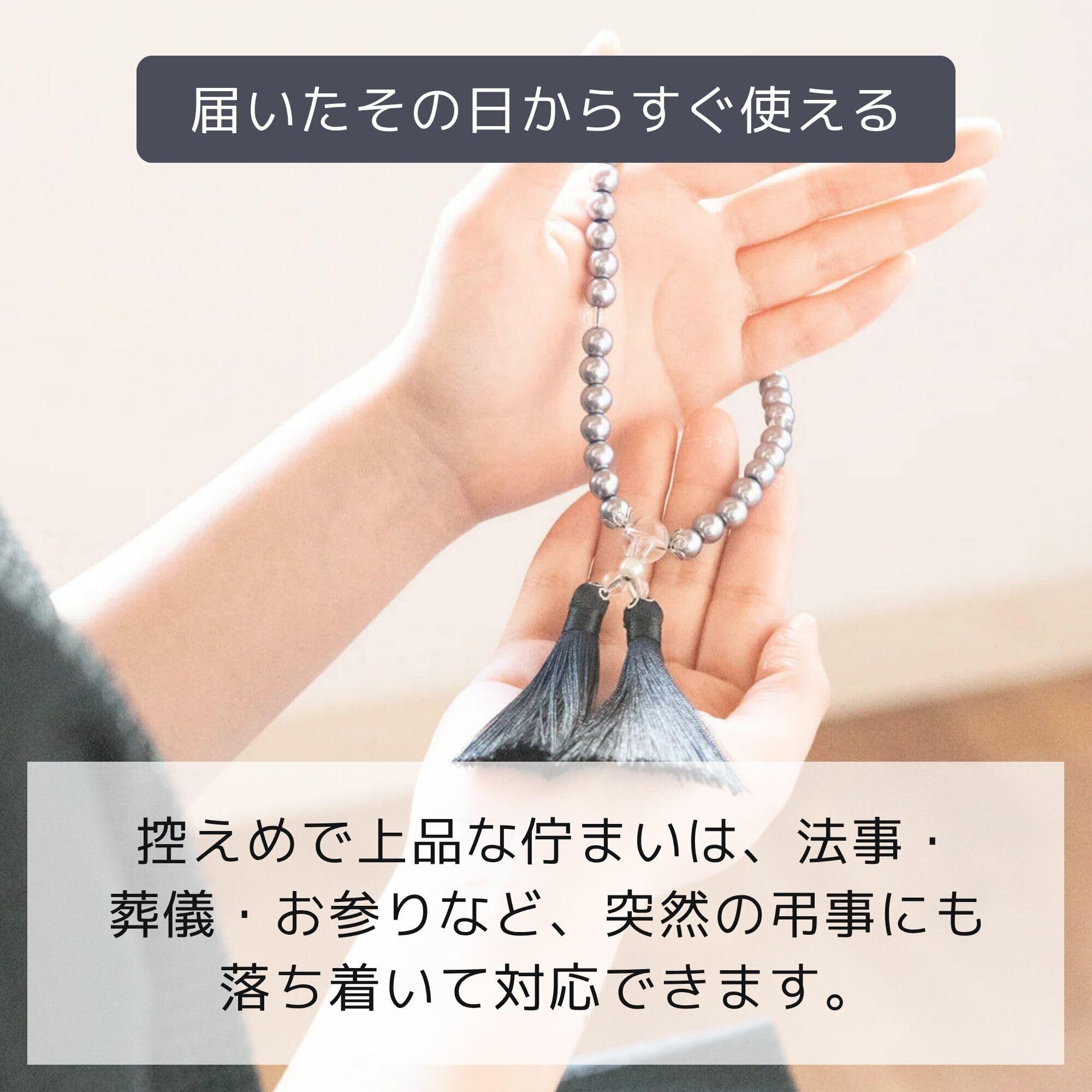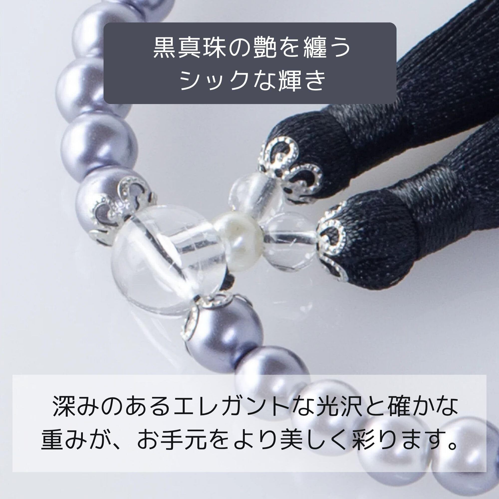 【黒貝パール】― 静かな輝きに想いを託して ― パールは、古くから「涙の象徴」とも言われています。 それは、人魚が恋人を想い流した涙が、海の波にはじけて宝石となった――そんな美しい伝説に由来しています。 そのため、パールは結婚式などの慶事はもちろん、お葬儀や法事などの弔事においても、心を伝える表現として大切に用いられてきました。 中でも「黒貝パール」は、深みのある落ち着いた輝きと、シックな光沢が特徴。 その上品で洗練された美しさは、持つ人の気品と想いをさりげなく引き立て、場にふさわしい装いを完成させてくれます。 葬送の場で、静かに寄り添う数珠として―― また、大切な方への贈り物としてもふさわしい、心を映す一品です。