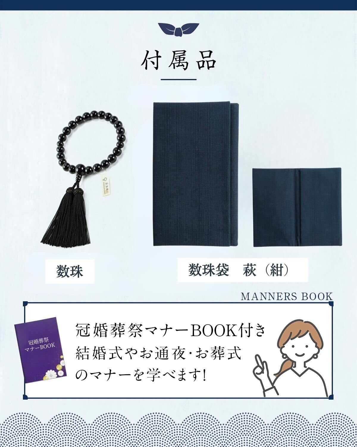 福正堂 数珠 念珠 男性用 葬儀 葬式 冠婚葬祭マナーBOOK付 黒壇 艶消し+数珠袋(萩 紺)