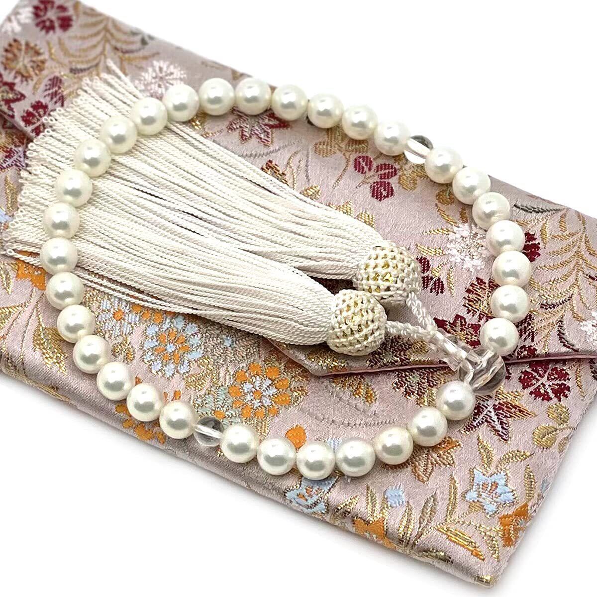 貝パールを使用した女性用の念珠です。落ち着いた白色の色合いが特徴で、上品な雰囲気を演出します。親玉には約10ミリの本水晶、主玉には約7ミリの貝パール、天玉には約5ミリの本水晶を使用しています。金襴を使用した念珠袋が付属しており、保管や持ち運びに便利です。天台宗、浄土宗、真言宗、浄土真宗、日蓮宗、曹洞宗、臨済宗など、すべての宗派でお使いいただけます。葬式や法事などのフォーマルな場面に適しており、手作りの丁寧な仕上がりが特徴の念珠です。