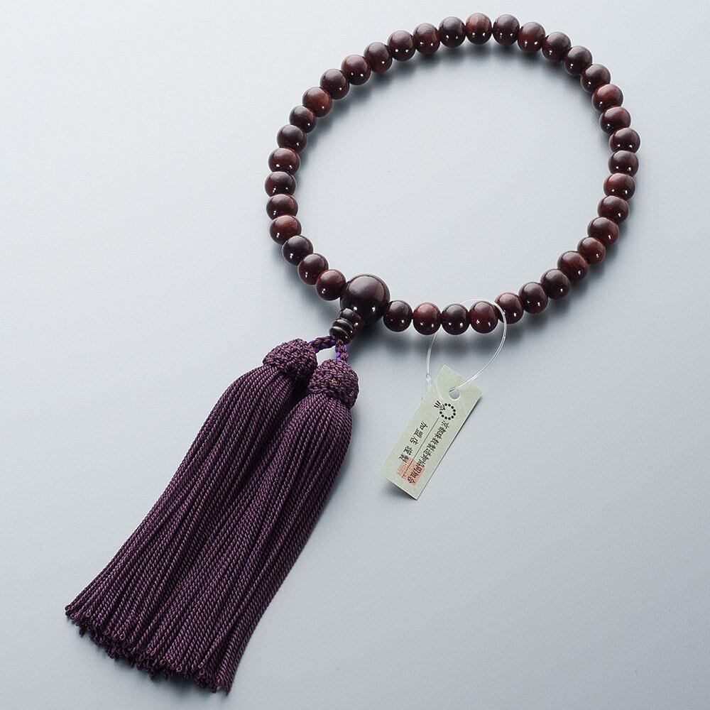 硬く耐久性に優れた紫檀を使用した女性用の念珠です。紫檀は正倉院御物の唐木細工にも多く使われ、古くから珍重されてきました。