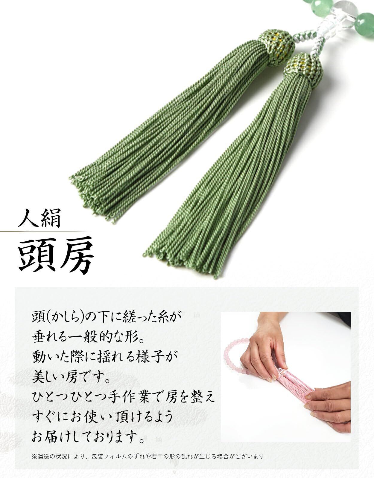 【サイズ】数珠を主に構成している珠(主珠:8mm玉)、玉の大きさが最も大きい中心的な珠(親珠:10mm玉)主珠の間にあり、略式数珠の場合は2つ(天珠:6mm玉)、人絹頭房