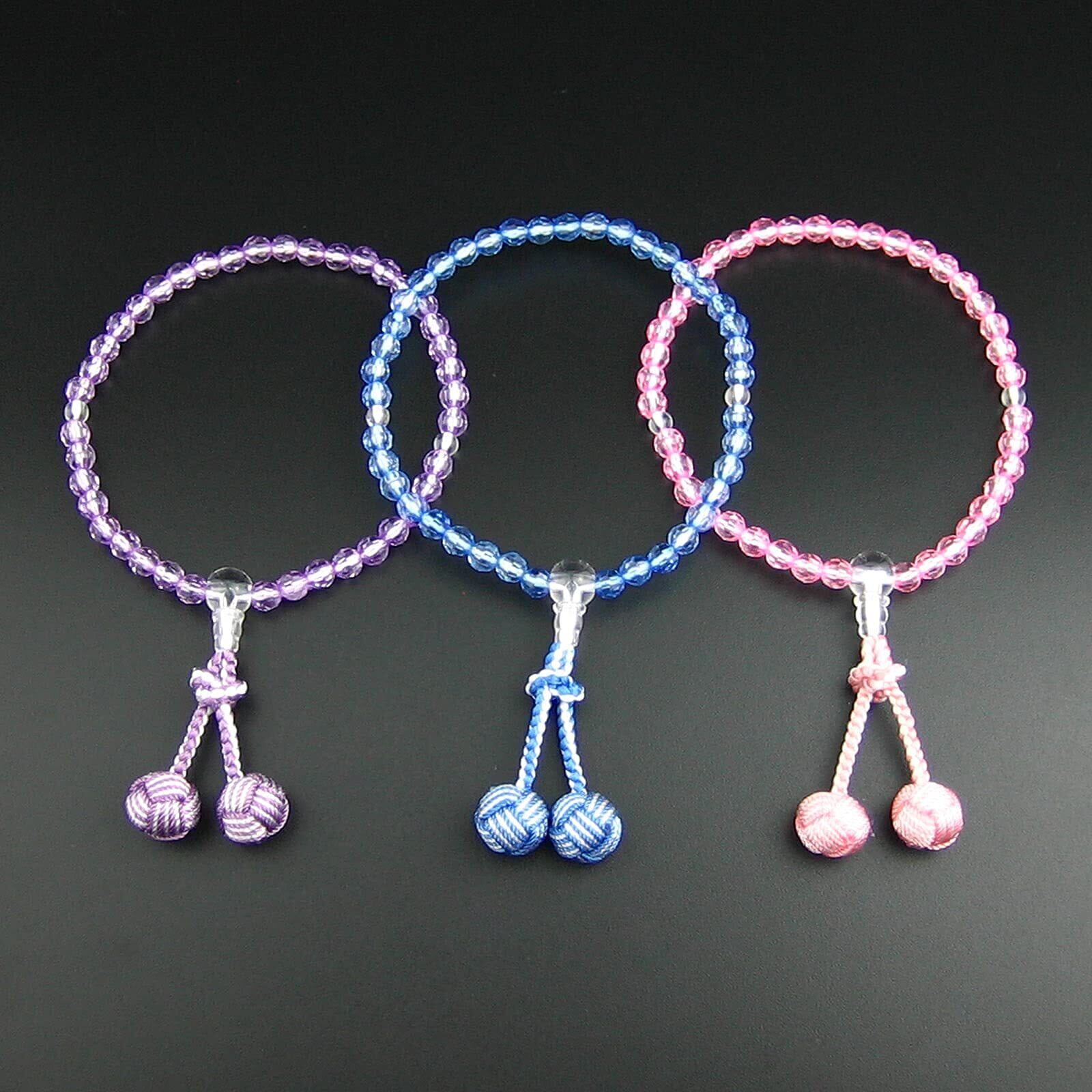人気なピンク、ブルーと紫三種類に用意しておりました。 玉は艶があり、ブリーンブリーンなカット水晶に採用してあります。素材はアクリル製ですので軽量で、割れる心配がなく安心です。幼児から小学生までくらいのお子さま向けでございます。 房は、丈夫で扱い易く、型崩れを起こさない小田巻梵天房がさらにバージョンアップし、お洒落な2色房となり登場です。とってもお洒落なお数珠に仕上がっております。