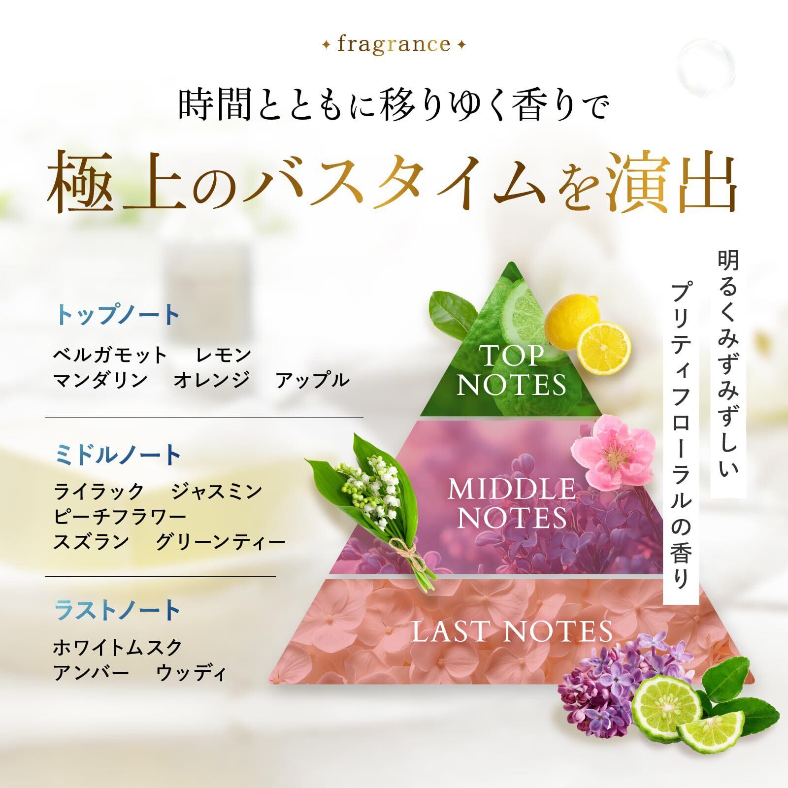 【明るくみずみずしいプリティフローラルの香り】バスタイムが自然と楽しみになるような、ほのかに広がる爽やかな香りを採用。頭皮ケアの時間がリフレッシュできるひとときへと変わります。洗い上がりの軽やかさと相まって、気分までスッと澄み渡るような心地よい仕上がりを感じていただけます。