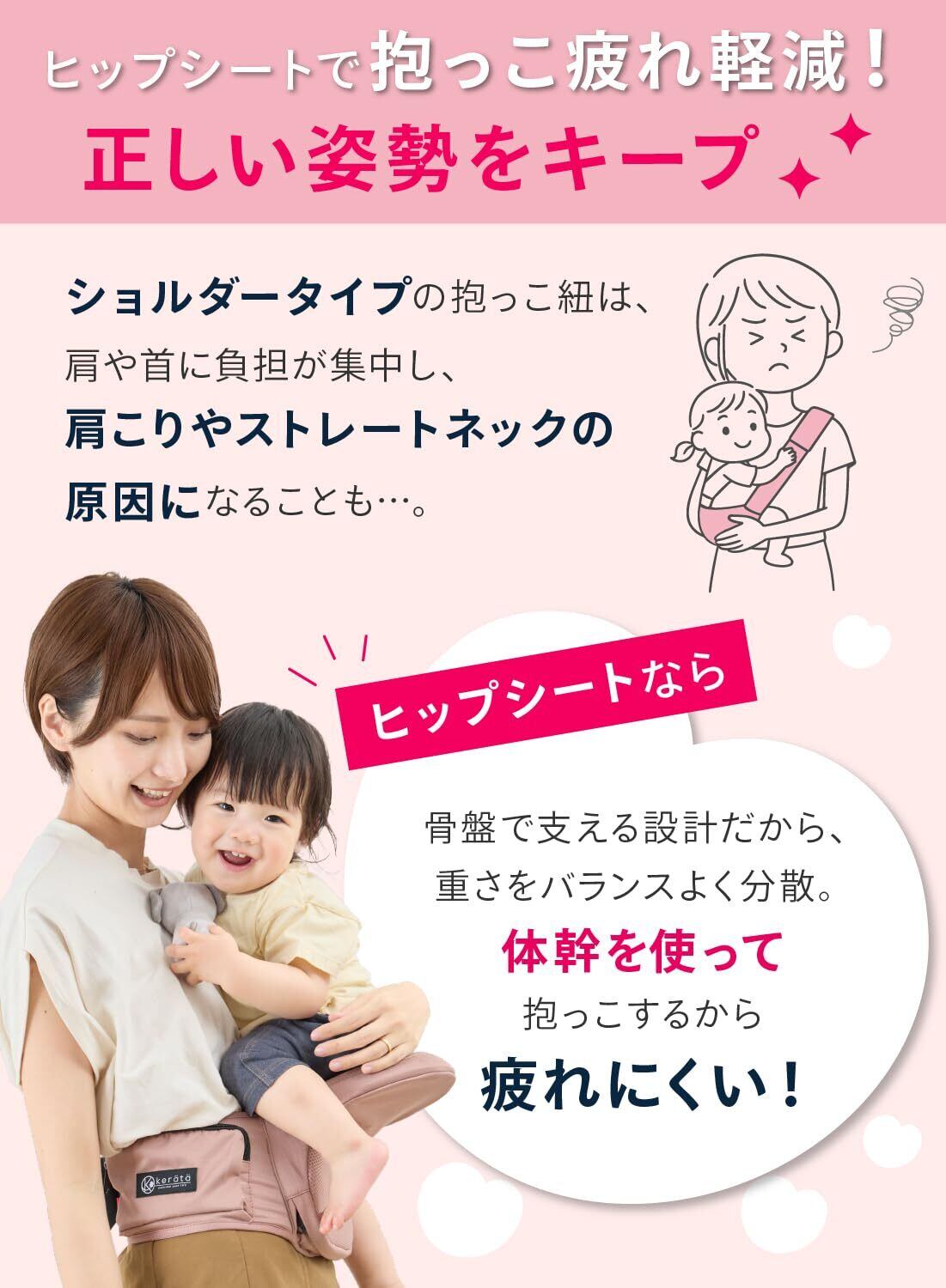 【赤ちゃんと一緒にもっといろんなところへ出掛けたい!】気軽に手軽に使えるので、ちょっとしたお出掛けに!使い方はシンプルなので、ヒップシートが初めてという方はもちろん、二つ目のキャリアーとしてもオススメです電車やバスなどの移動時や、荷物が増えるお買い物、お散歩はもちろん、イベントや旅行など、さまざまなシーンでお使い頂けます。アクティブなお出かけはもちろん、赤ちゃんがおねむモードの時も◎!赤ちゃんと密着できるので、お母さんのぬくもりを感じながら、安心して眠れます「抱っこ!」「降ろして!」のわんぱく赤ちゃんにもオススメです! 【対象年齢】3カ月~ 【推奨耐荷重】15kg【サイズについて】ウエスト最大110cmまでベルト調節可能 *帝王切開でご出産されたお客様へ:ヒップシートは構造上、下腹部に一定の力がかかる仕様になっております。お子さまの重みで下腹部の痛みが生じる場合がございますのでご注意ください。