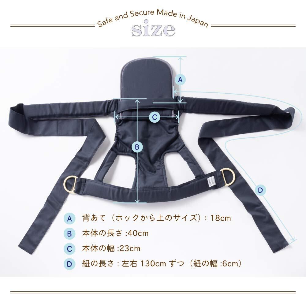 <カラー>ピンクベージュ/ブルーグレー/サンドベージュ/カーキ/ダークネイビー/ブラックの全6色。ベビーギフトショップオリジナルカラーです。<素材> 綿100% スポンジ部分:ウレタン <サイズ> フリー <使用月齢> *だっこ 首が座ってから(4ヶ月)~12ヶ月(体重:約10.2kg) *おんぶ 首が座ってから(4ヶ月)~30ヶ月(体重:約14.9kg) ※首の座らない乳児に使用しないでください。 <洗濯方法> 手洗い、陰干し、乾燥機使用不可 色落ちすることがありますので、他のものとは別に洗ってください。 洗剤によっては蛍光増白剤が移染することがあります。