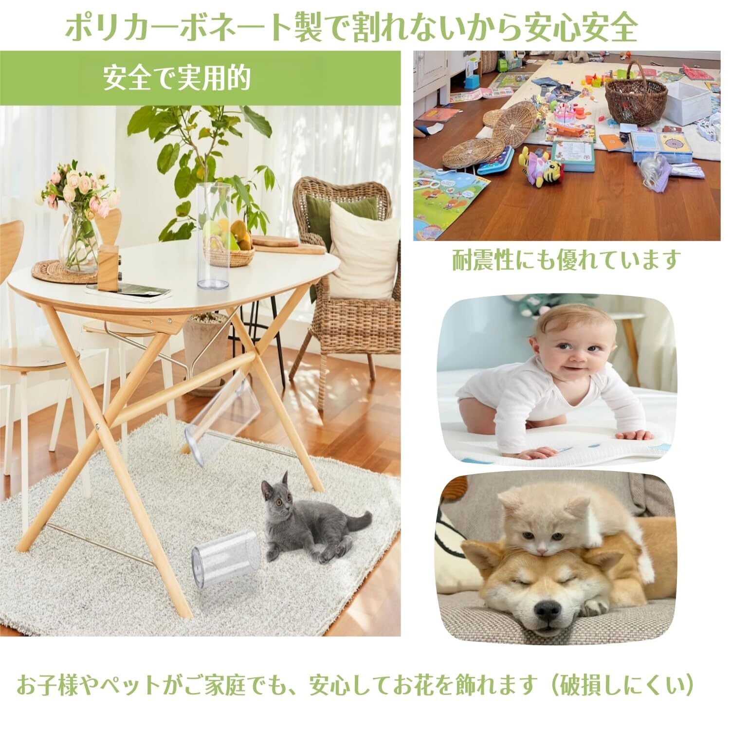 5大魅力で選ばれる 割れないアクリル花瓶 【1. �️ ガラスの美しさ × アクリルの強さ】 → 「水晶のような透明感」 と 「落下しても割れない」 を両立! ※ペットやお子様がいるご家庭でも安心の耐久性。