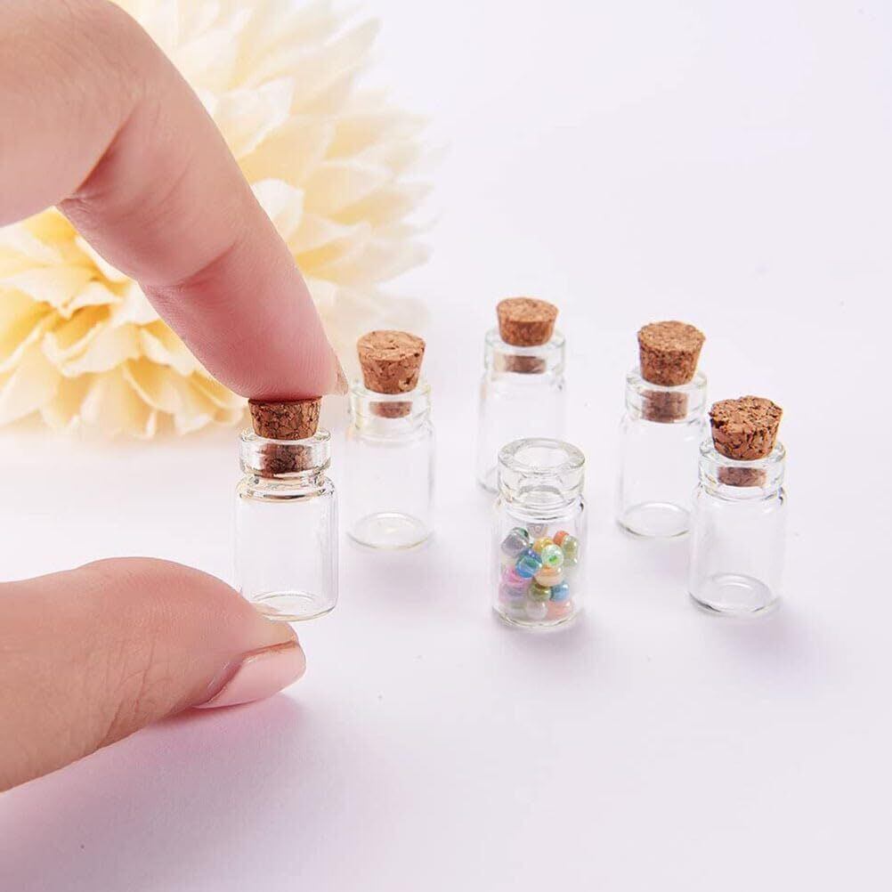 強力な密閉性を持つコルク栓付きミニガラスボトル:透明な0.5ml容量のガラス製ボトルに耐久性のあるコルク栓を採用し、中身の漏れを防ぎつつ簡単に開閉できるため、願い事や小物の保存に適しています。