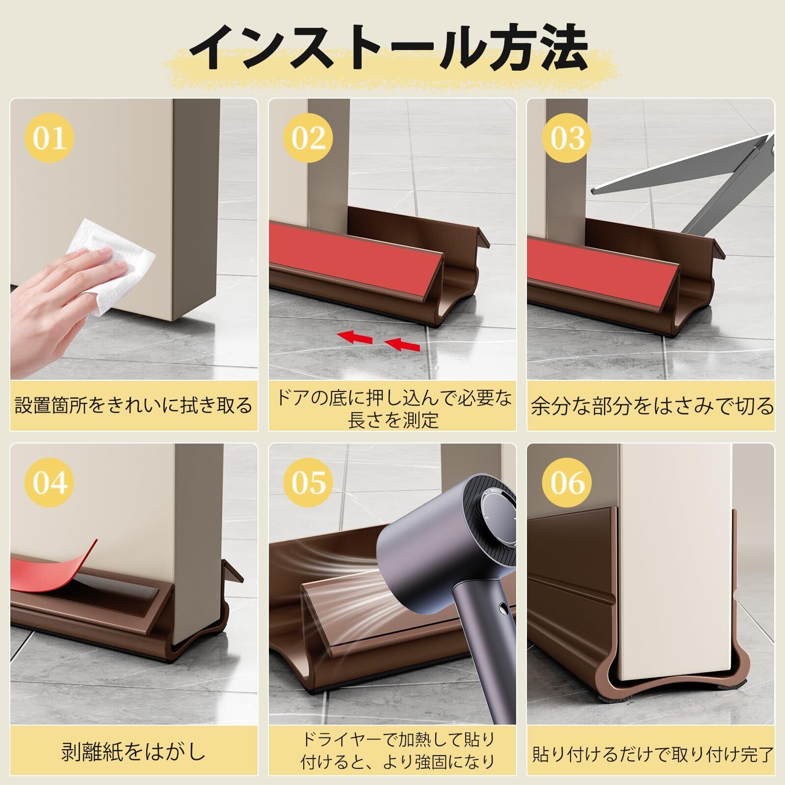 【高品質PVC素材・自由にカット可能】ご自宅のドアのサイズ、実はまちまちではありませんか?このドア隙間風防止ガードは、高品質で耐久性に優れたPVC素材を使用。ハサミで簡単に長さを調節できるので、どんなドアにもぴったりフィットします。PVC素材は柔軟ながらも強度があり、長期間使用しても変形しにくいのが特長。ほこりや虫の侵入を防ぎながら、隙間風をシャットアウト。マンションや戸建てなど、あらゆるお住まいのドアに簡単取り付け可能な、優れものです。