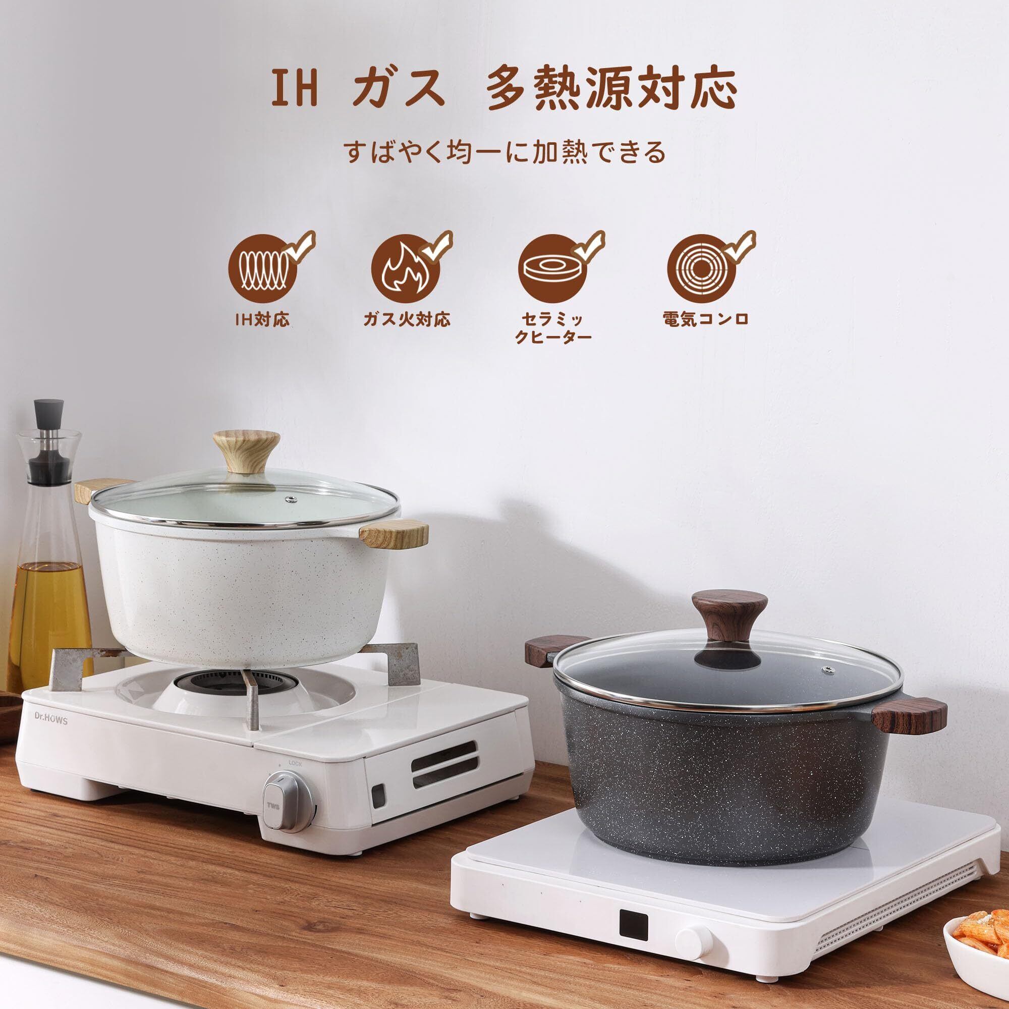 【IHもガス火もオール熱源対応】IH、ガスなど様々な熱源に対応。高熱伝導ステンレス層が熱をムラなく伝え、たっぷりの料理も素早く火が通ります。 美味しさをすぐに楽しめる、効率的な調理を。