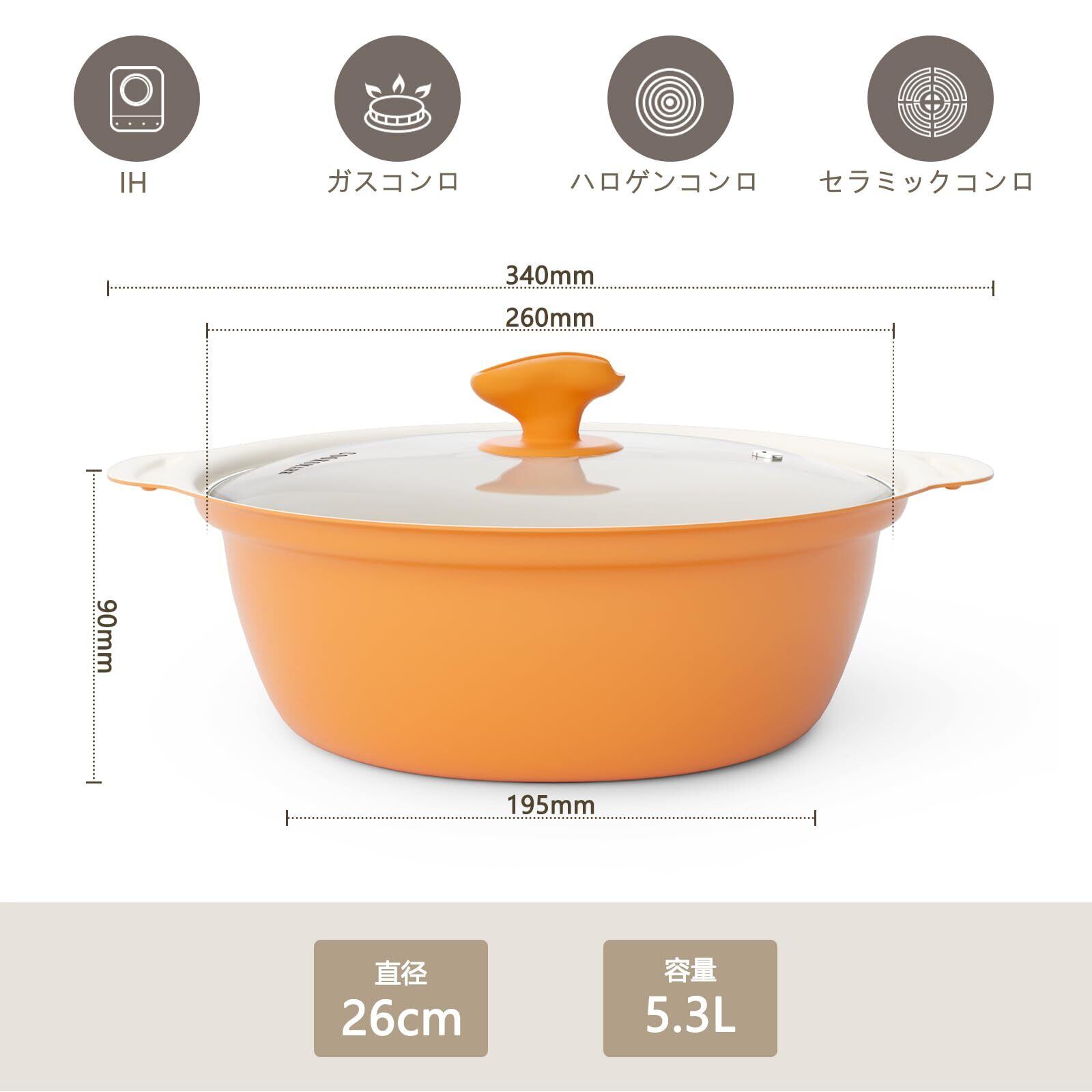 【卓上鍋の商品仕様】重量(約): 1.4kg 満水容量: 5.3L。目安:2-4人用。サイズ(約):340*300*90mm。ガラス蓋付き、料理中に中の様子が見える。対応熱源:オール熱源・IH対応・ガスコンロ対応(電子レンジ・オーブンには使用できません)。材質:本体:アルミニウム合金、はり底:ステンレス鋼、(耐熱温度450℃)、コート:天然セラミックコーティング、ガラス蓋:強化ガラス(安全と健康の)。