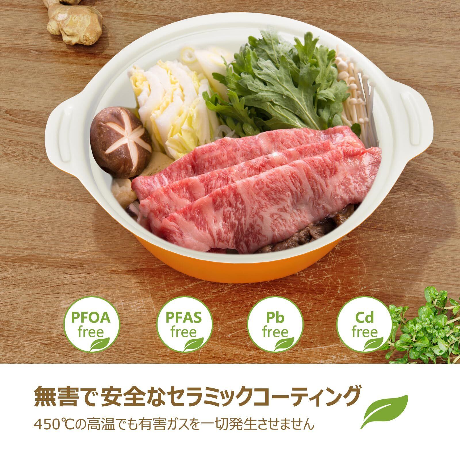 【健康素材&安全安心】体に悪影響を与える PFOA・PFOS・鉛・カドミウムなどの有害物質を含まない。人間と地球環境に優しい材料が使われています。この両手鍋は、然セラミックコーティングを採用し、その焦げ付き防止性能は一般のセラミック調塗装の2~4倍。お料理がスムーズで、お手入れも簡単です。