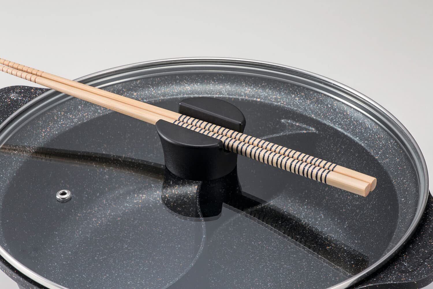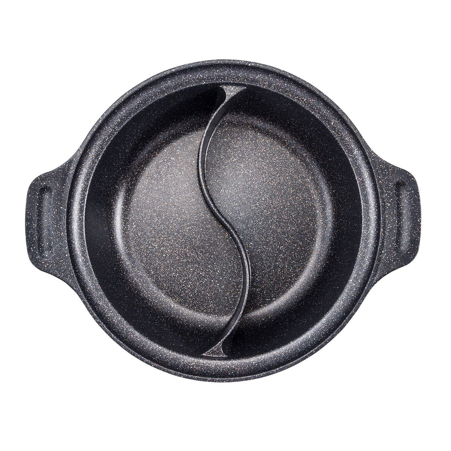 サイズ:28㎝ | パターン(種類):二食鍋 2つの味が同時に楽しめる二食鍋(内面 耐摩耗性試験100万回クリアー)。内面ダイヤモンドコート+マーブル加工でこびりつきにくくお手入れ簡単。外面もふっ素樹脂加工+マーブル加工なのでお手入れ簡単です。仕切り付なので二つの味が同時に楽しめます。つまみには菜箸やおたまが置けます。内面ダイヤモンドコート+マーブル仕様で耐摩耗性試験100万回クリアー。オール熱源対応。