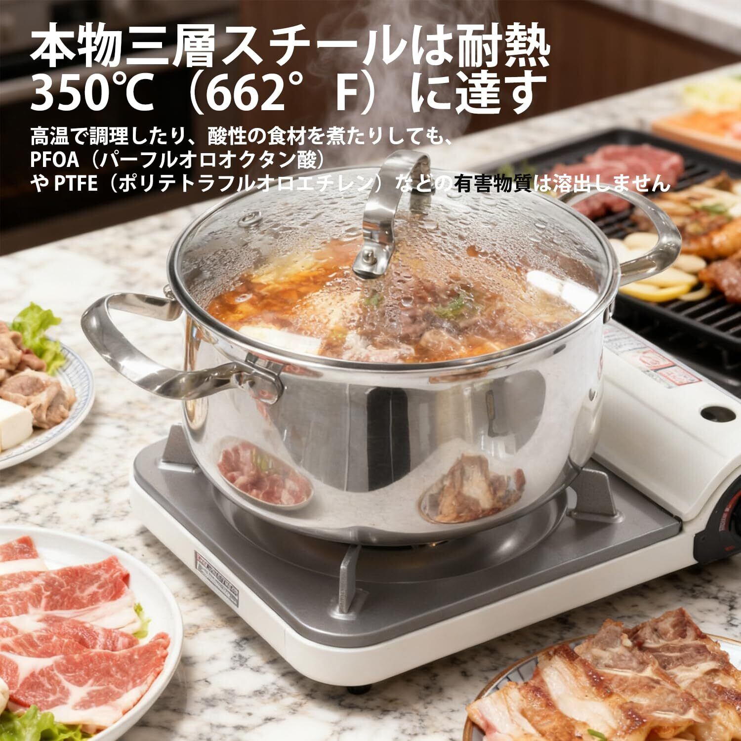 三層複合ステンレス製両手鍋は三層構造を採用しています。内層は18/8 食品級ステンレス、中間層は熱伝導用アルミ層、外層は18/0 導磁ステンレスです。肉厚な素材を使用しているため、この蓋付き鍋は堅牢で耐久性に優れ、耐荷重性にも優れています。