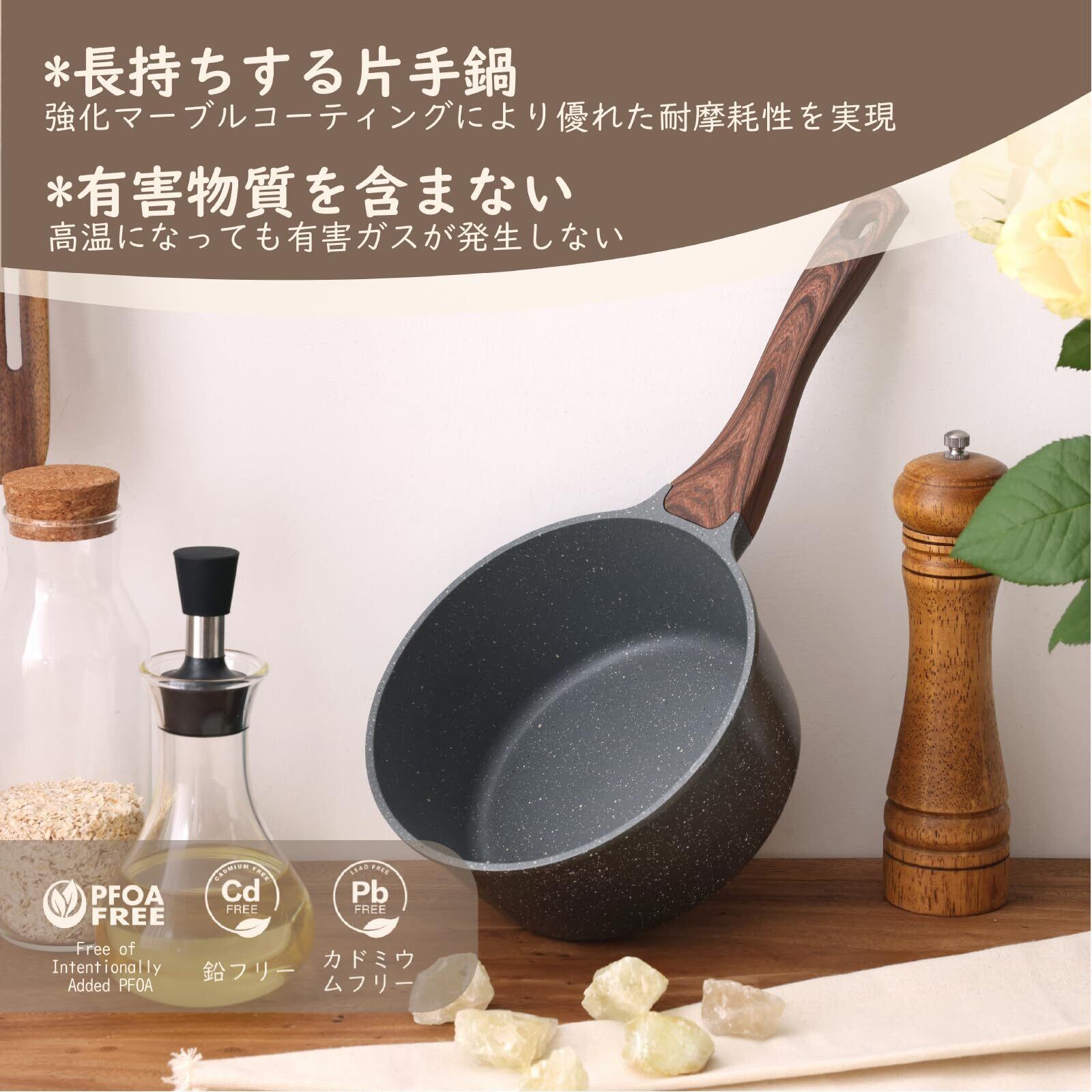 【PFOAフリー・焦げ付かない・安全】SENSARTE非粘着ソースパンは国際認証を取得しています。PFOAなどの有害物質を含まず、焦げ付かないです。内側2層構造の焦げ付き防止・耐磨耗マーブルコートコーティング