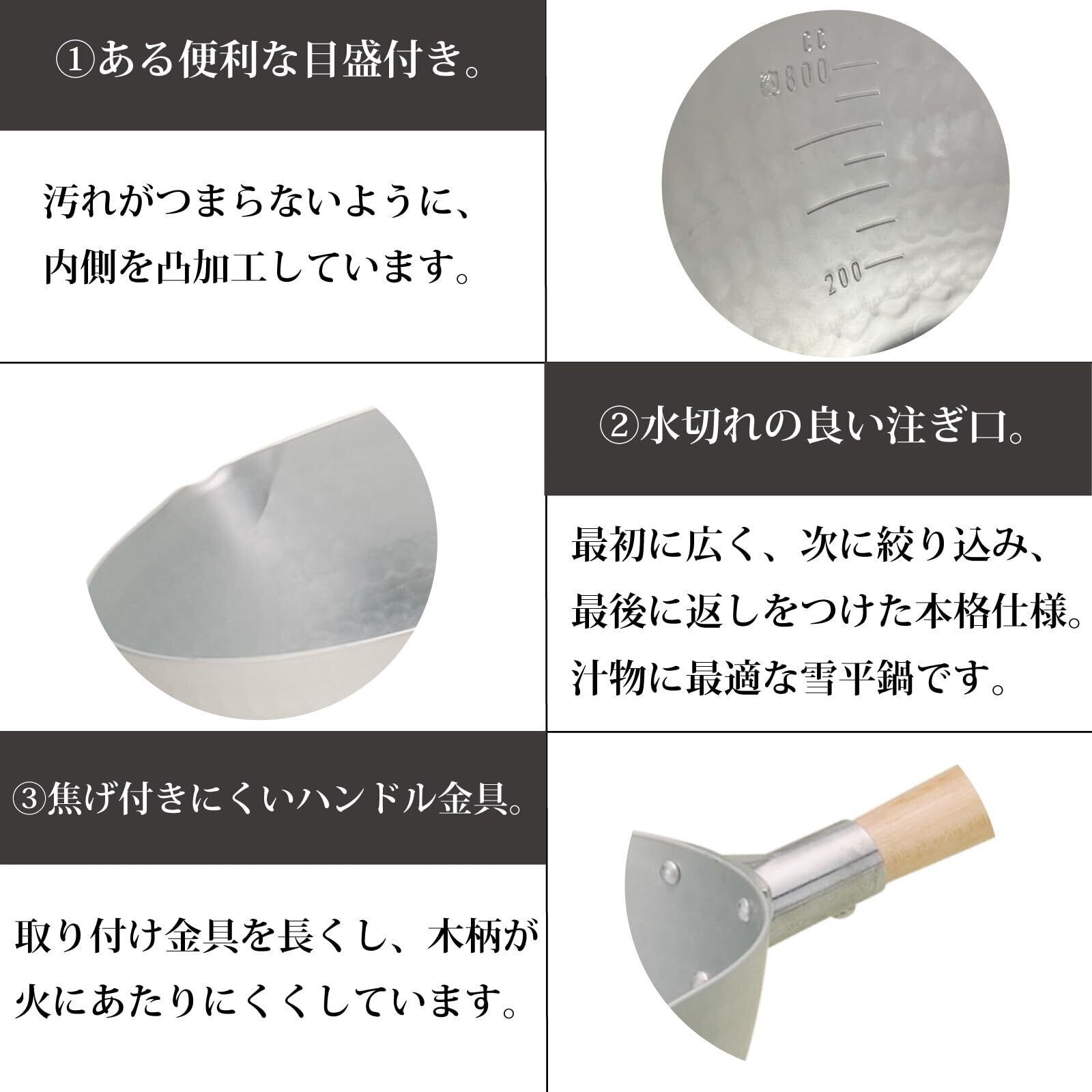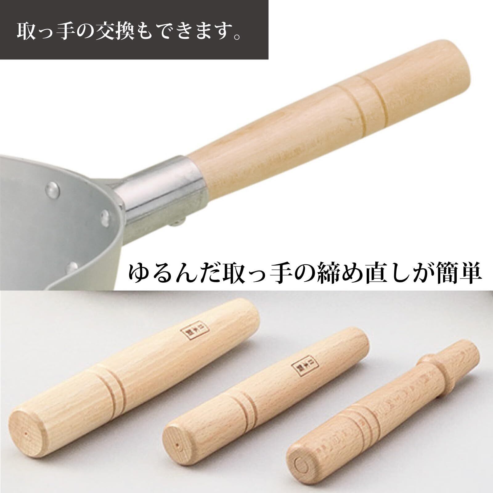 本 体:アルミニウム合金表 面:硫酸アルマイト加工取っ手・つまみ:天然木
