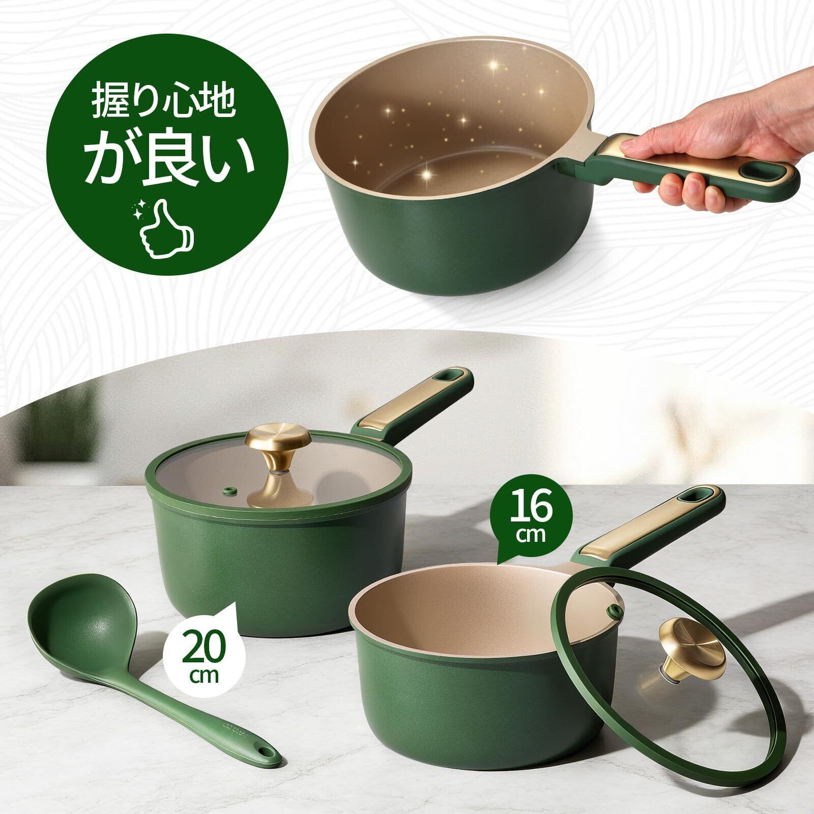 CAROTE カローテ 片手鍋 16cm 蓋付き 食洗機対応 IH対応 ミルクパン PFOAなどの有害物質不使用 PFOA PFOS フリー 3層コーティング マーブルコーティング くっつきにくく洗いやすい 軽量 一人鍋 揚げ物 一年 緑&ゴールド 耐摩耗性テスト100万回クリア 緑&ゴールド 730日 | 毎日発送✿はなまる