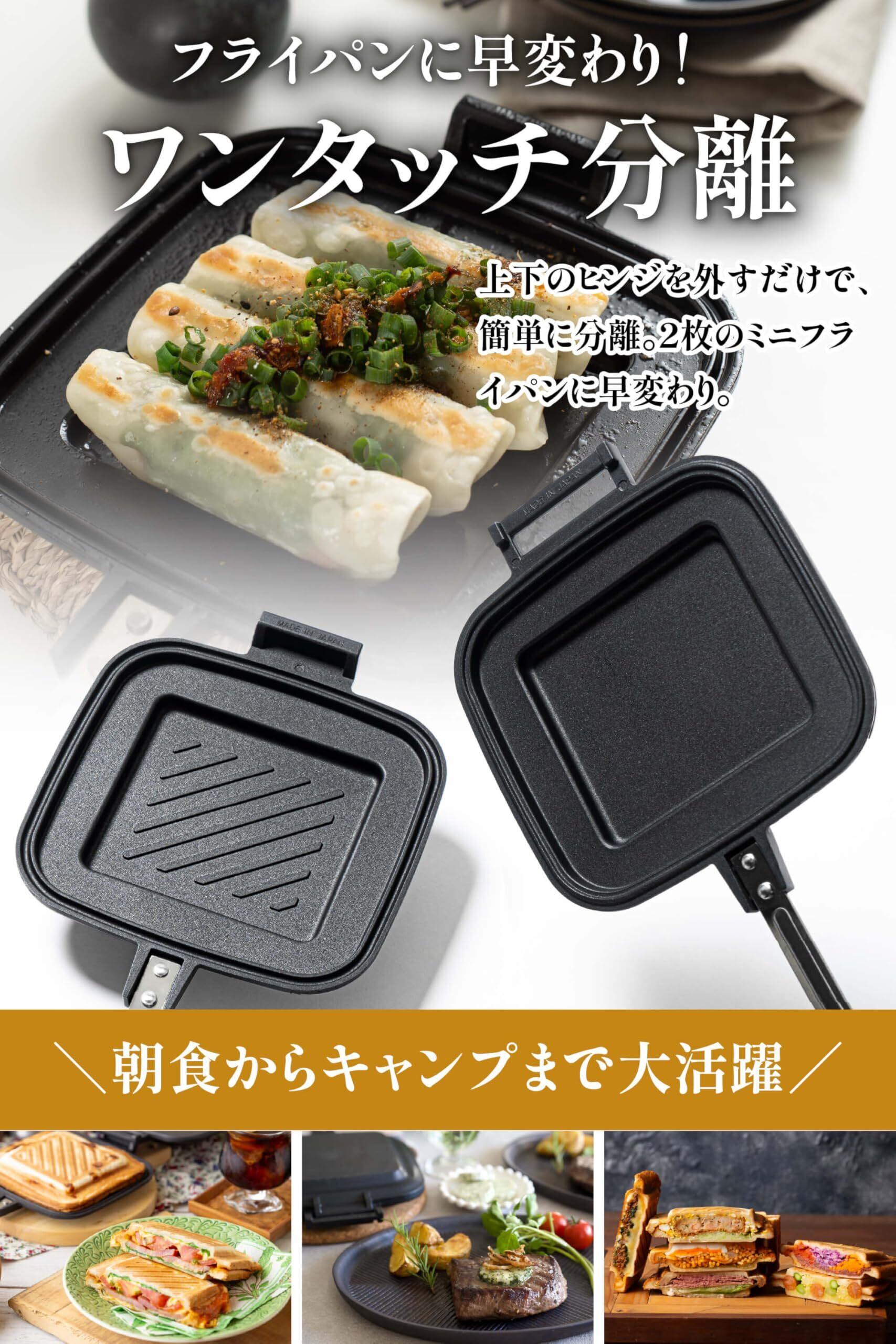 【2面タイプ/上下分離型】こんがり焼き目が入ったホットサンドが作れる「ななめ焼き面」、目玉焼きやお好み焼きなどを手軽に調理できる「フラット面」の2面タイプ。簡単に取り外して分離できるため、2枚のミニフライパンとしても利用可能。キャンプ・アウトドア用品としても活躍する調理器具。