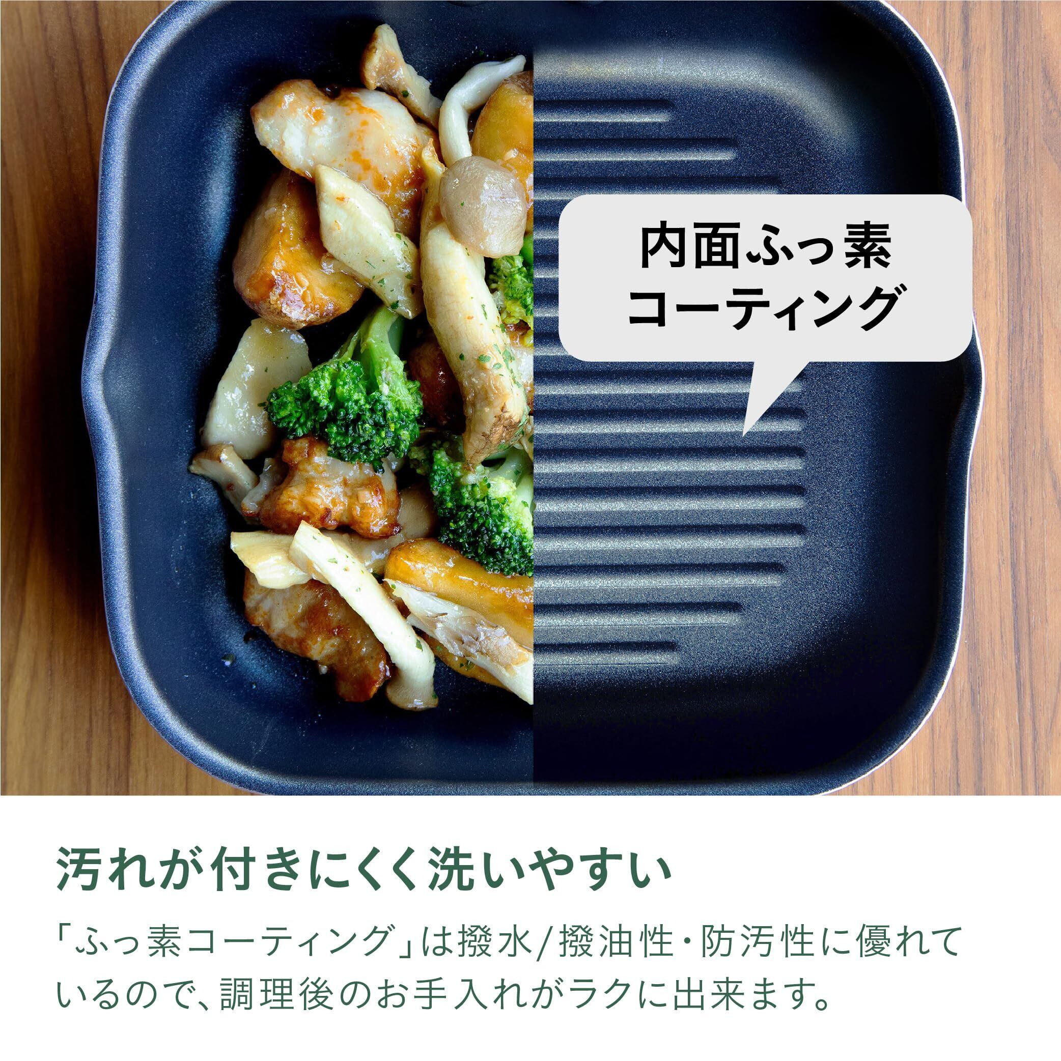 グリルパンの調理面は汚れが付きにくい”ふっ素コーティング”で少ない油で調理もしやすく、お手入れも洗いやすくラクにできます