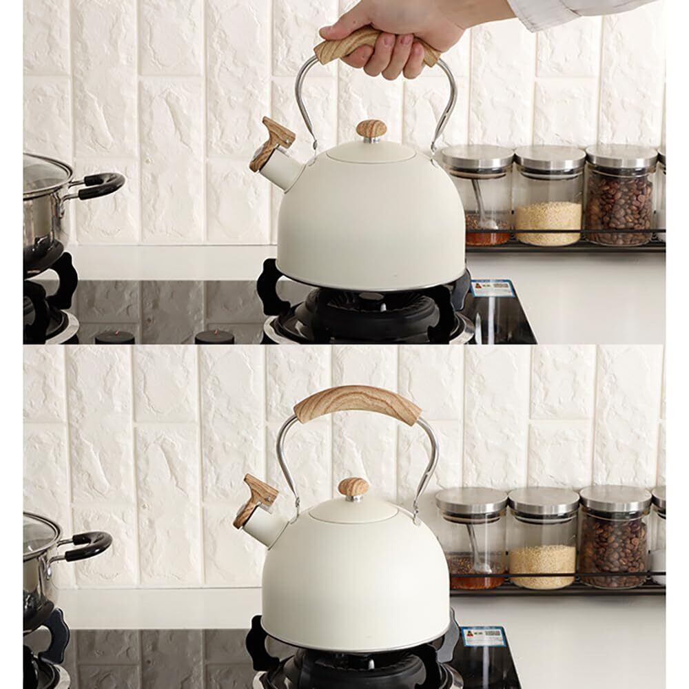 Yanhaoやかん 笛吹きケットル 2.5L 広口 ケトル ステンレス製 木目ハンドル 大容量 IH対応 やかん おしゃれ 調理器具 (オフホワイト)