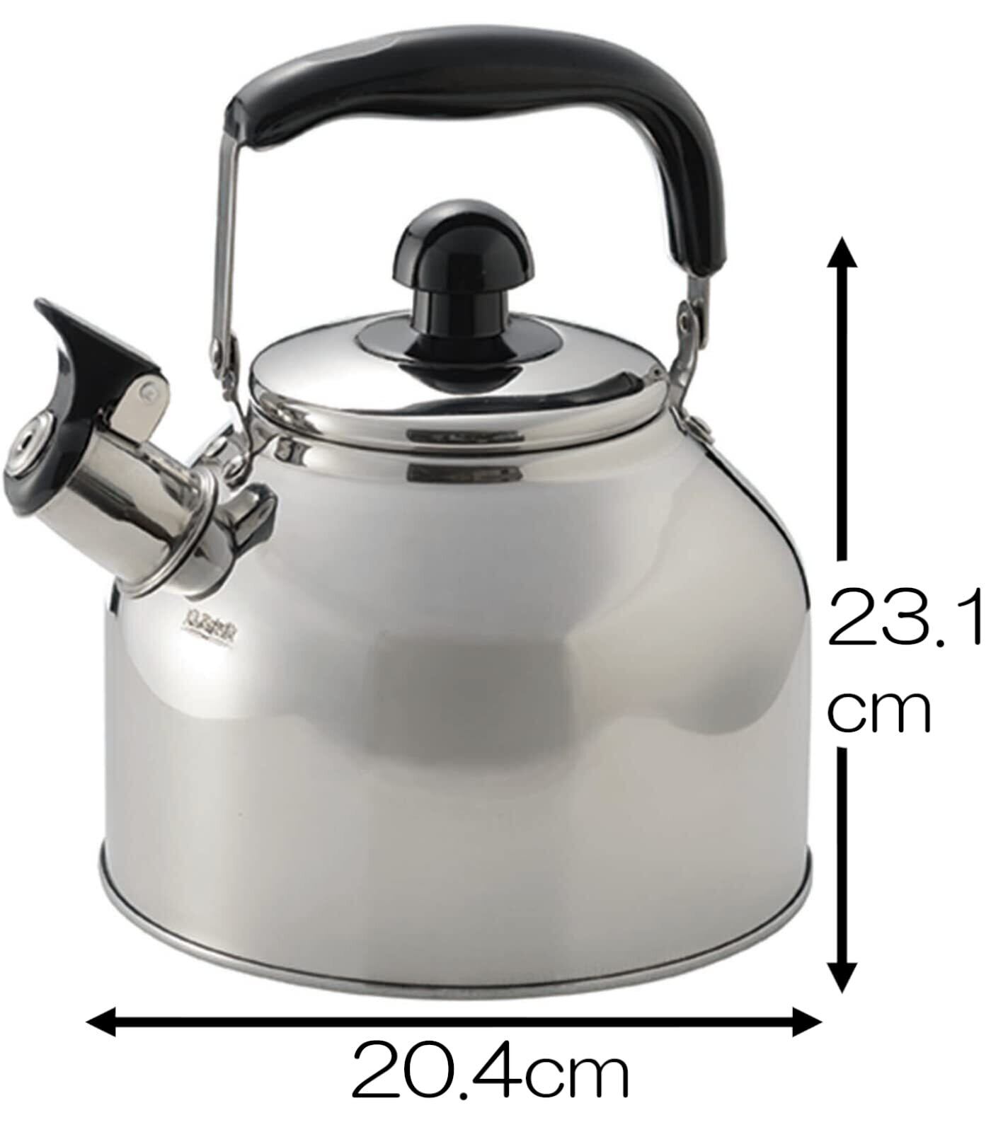 【NIRWAKA】ニルワーカ お湯が沸くと笛を鳴らしてお知らせ! 広口形状で、使いやすい、洗いやすい! HI100V・200V対応 ガスコンロ対応 <商品特徴> 熱効率が高く、安定感もバッチリ、使いやすい底面設計! サビにくく、丈夫で衛生的なステンレス製! <商品仕様> 素材:側面/ステンレス鋼、底面/ステンレス鋼(底の厚さ:0.5mm) フタ/ステンレス鋼、取手・つまみ・笛部/フェノール樹脂 商品サイズ:23.1×20.4×24.6mm 満水容量:3.6L/適正容量:2.7L 重量:755g