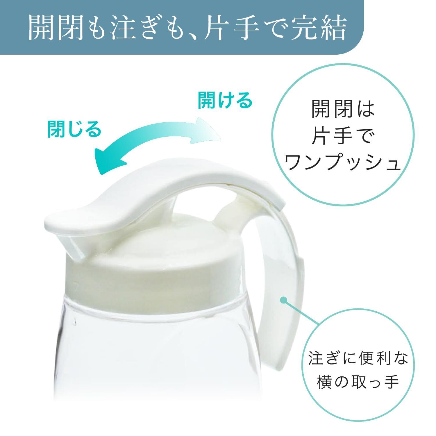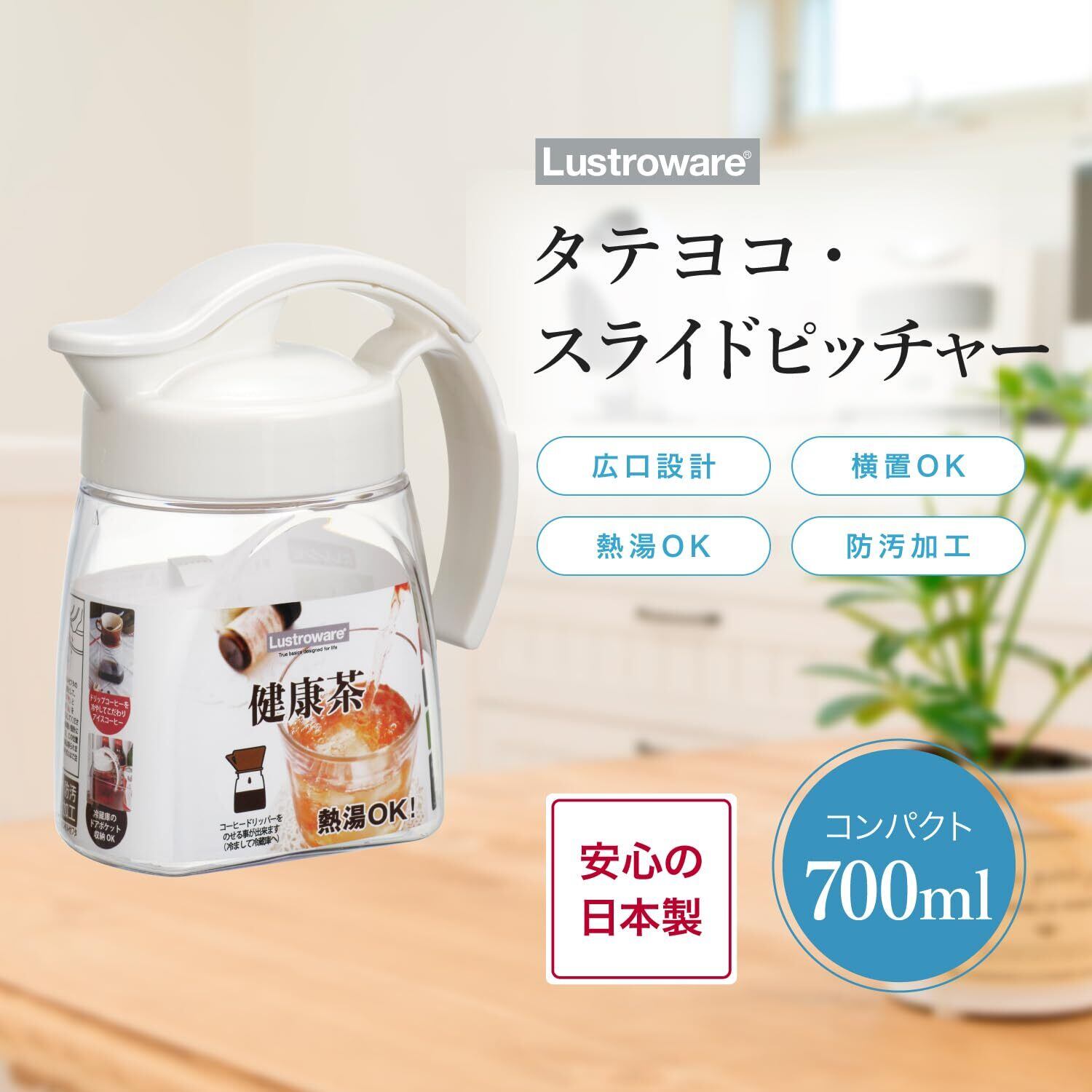 岩崎工業 ラストロウェア タテヨコ・スライドピッチャー 700ml コンパクト 麦茶ボトル 熱湯対応 横置き スライド式 広口 取って付き ホワイト K-1294