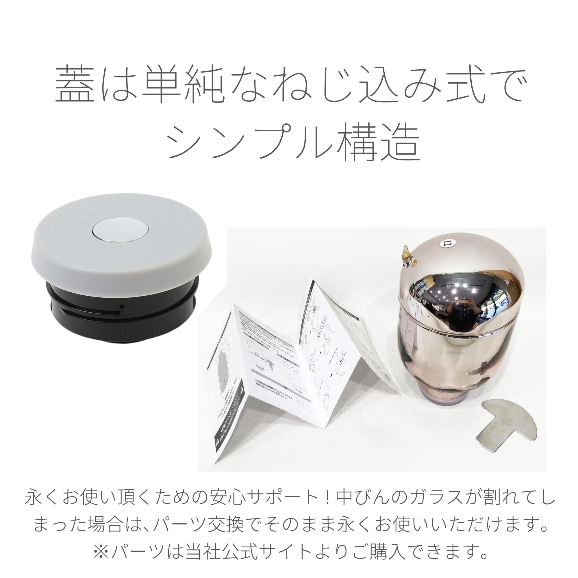 ・蓋は単純なねじ込み式でシンプル構造 パーツも少なく壊れにくく丈夫で長持ちするように設計されています。 ・軽くて頑丈な本体設計 蓋と本体は軽量なポリプロピレン樹脂を採用。巧な技術で内部のガラスを安全に守ります。