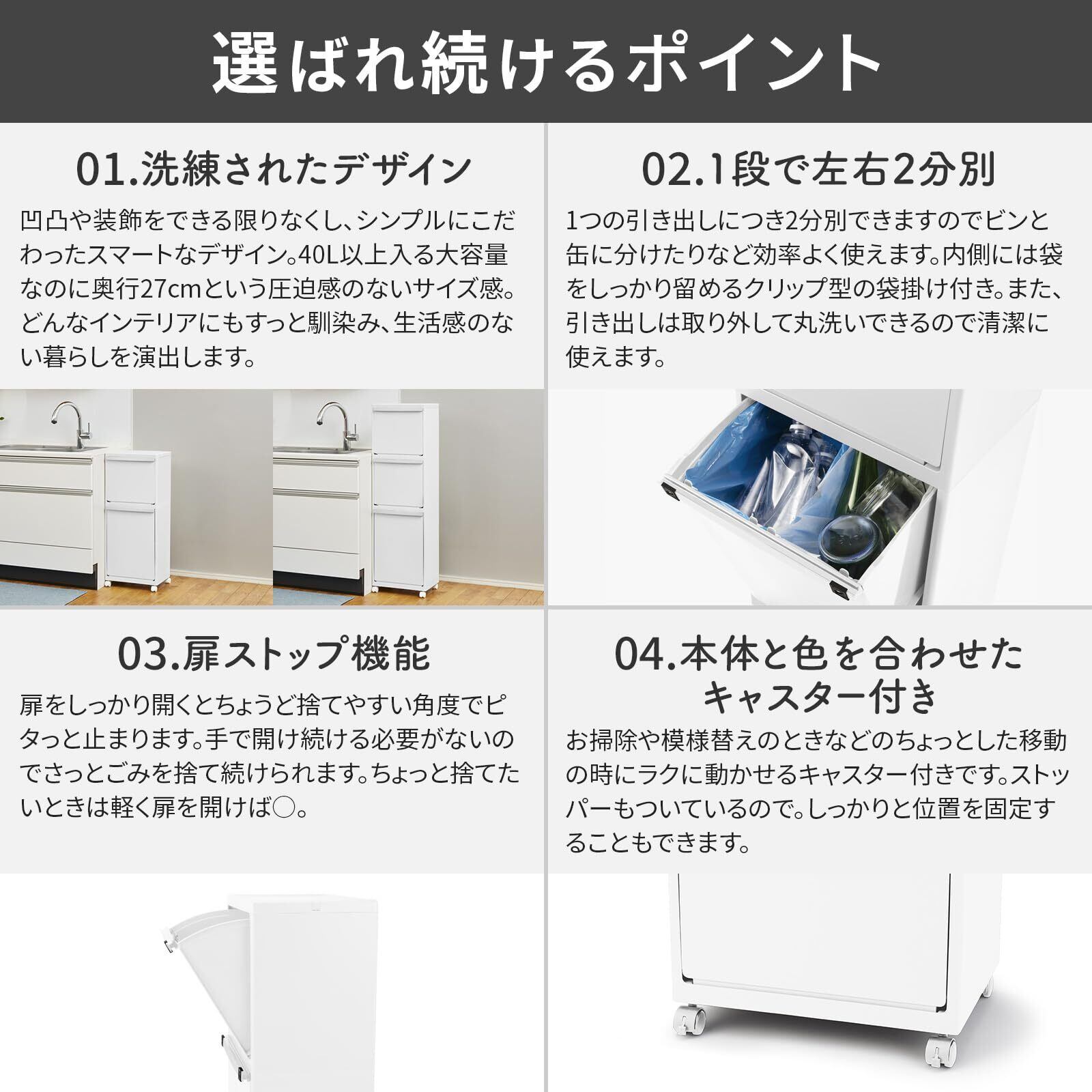 洗練されたシンプルなデザインでお部屋に置いてもインテリアの邪魔をしない多段分別ゴミ箱。場所を選ばないシンプルなデザインで、移動に便利なキャスター付き。狭いところにも置きやすく、仕分けのできる「分別タグ」付き。扉をしっかり開くとちょうど捨てやすい角度でピタッと止まるので続ける捨てることも可能。1つの引き出しにつき2分別可能。内側には袋をしっかりと留めるクリップ型の袋掛け付き。本体の両サイドにはレジ袋などがかけられるフック付き。使わないときは内側に収納できるので邪魔にならない設計。