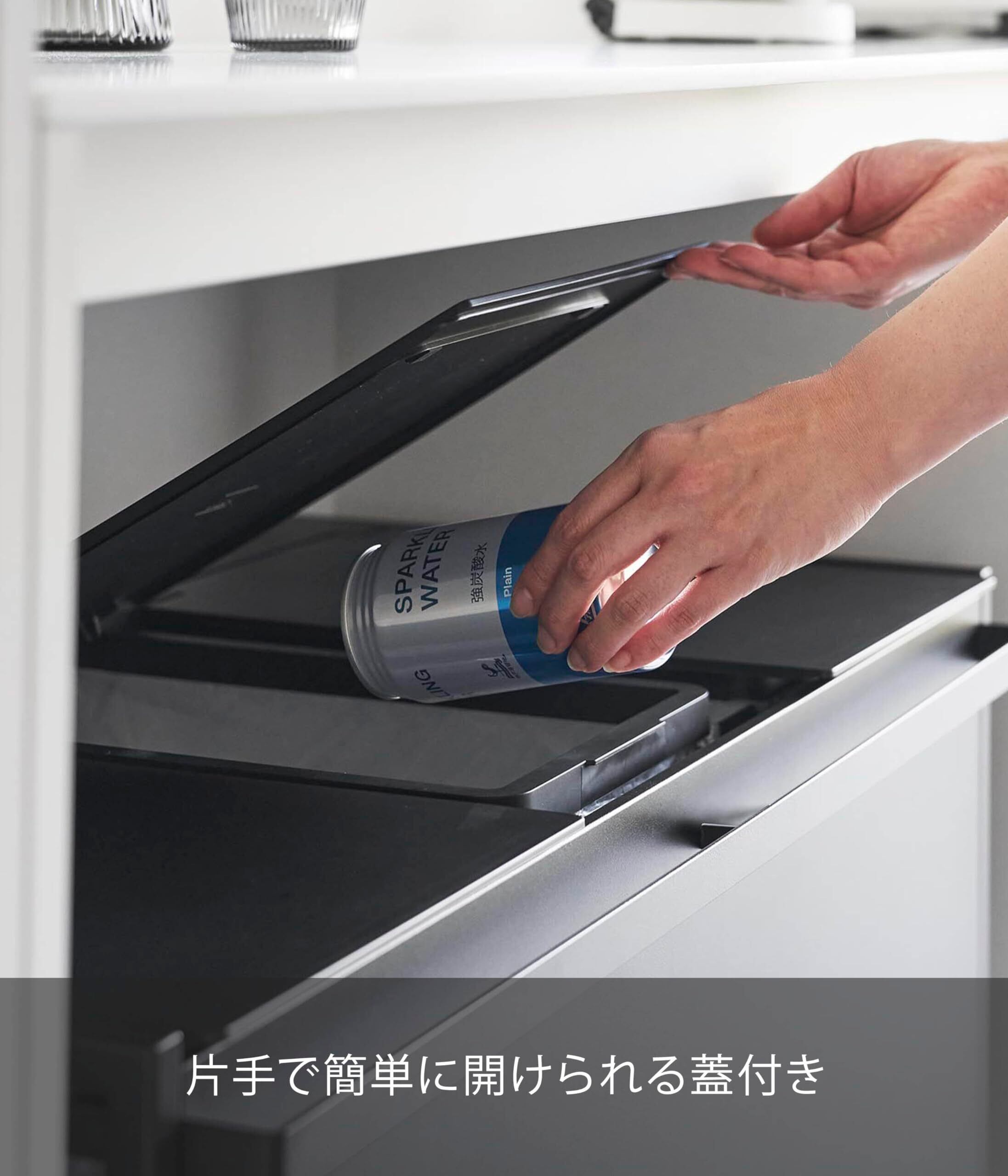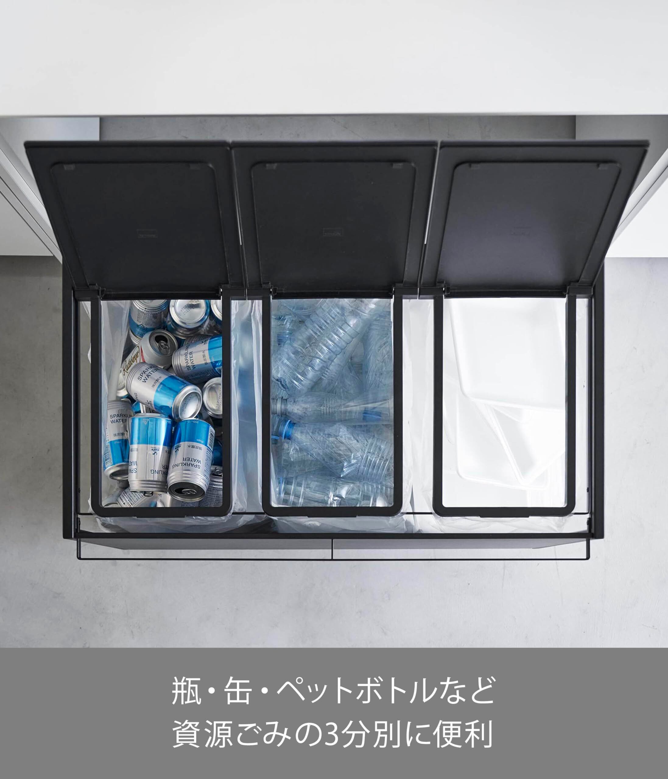 瓶・缶・ペットボトル・プラスチックなどを分別できて、捨て場所に困る分別ゴミもカウンター下のスペースに隠して収納できるので、インテリアになじみます。