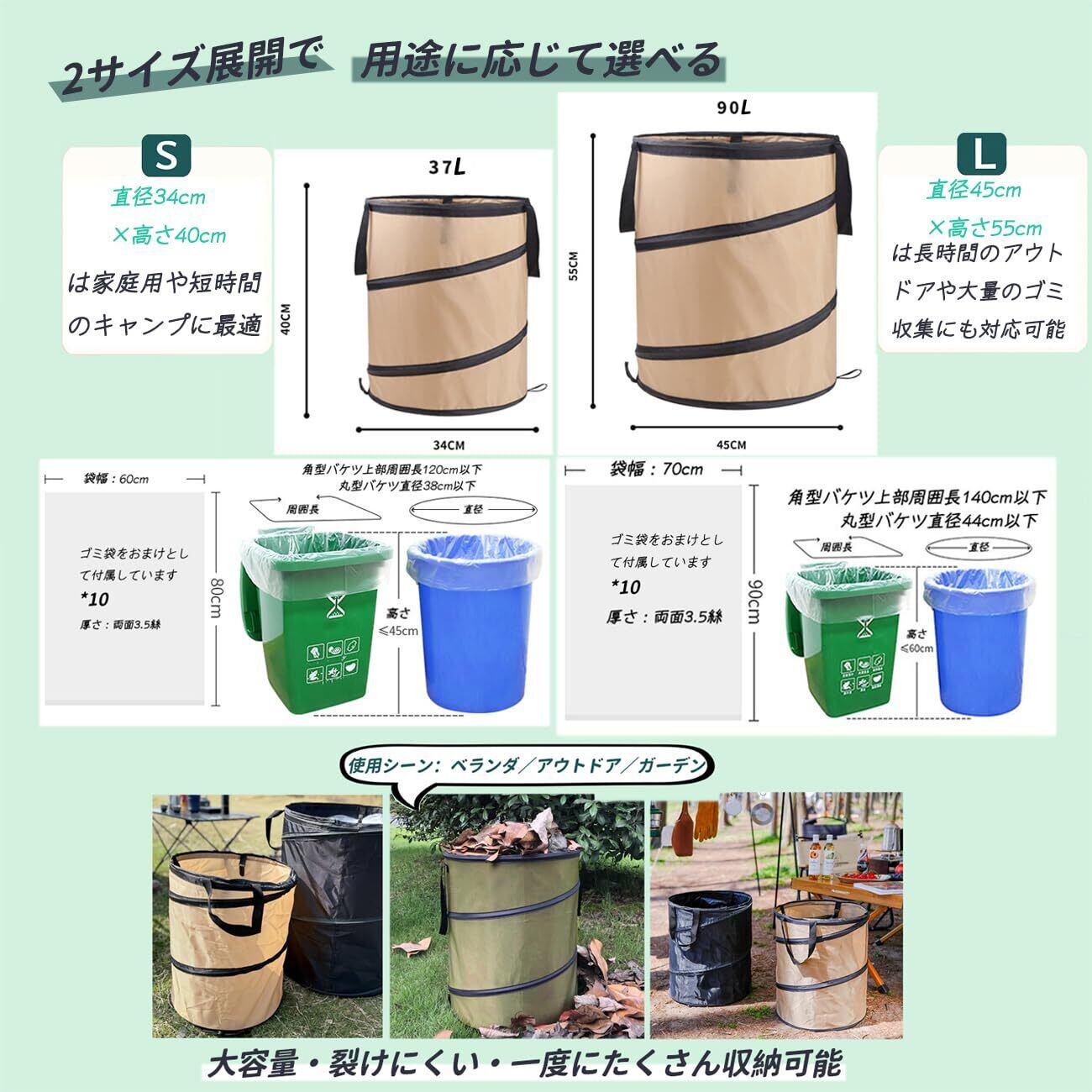 大容量・省スペース設計. 使用時はMサイズ約90L(直径45cm×高さ55cm)、Sサイズ約37L(直径34cm×高さ40cm)とたっぷり収納。未使用時はMサイズ50×50×4cm、Sサイズ38×38×4cmにコンパクトに折りたたみ可能。それぞれ専用ゴミ袋10枚(M:70×90cm/S:60×80cm)付き。
