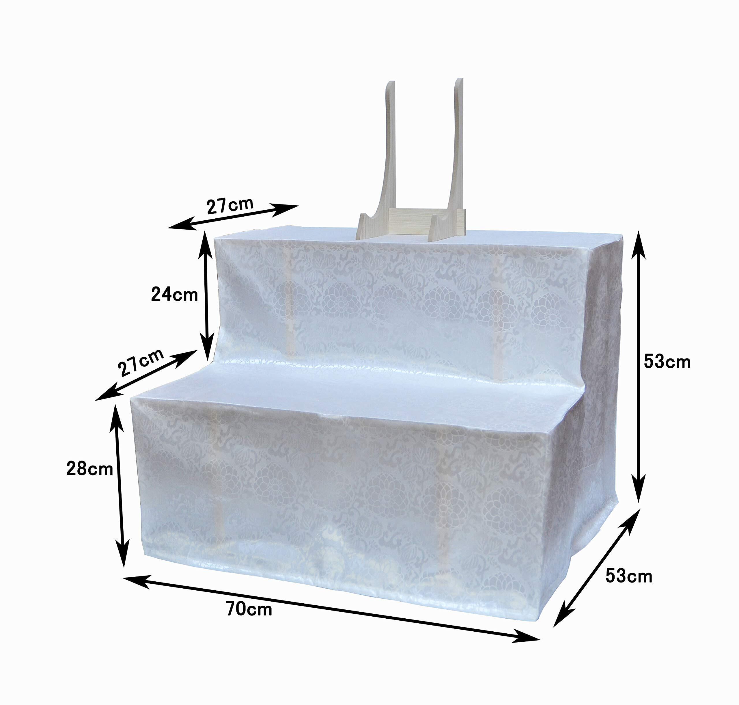 規格:総幅70×総高さ53×総奥行52cm(下段高さ28cm×下段棚板奥行27cm、2段目高さ25cm×2段目棚板奥行27cm) 重さ:3.5kg 材質:木製。備考:組み立て式(説明書付)、白布付き、写真立て付き(高さ29cm)