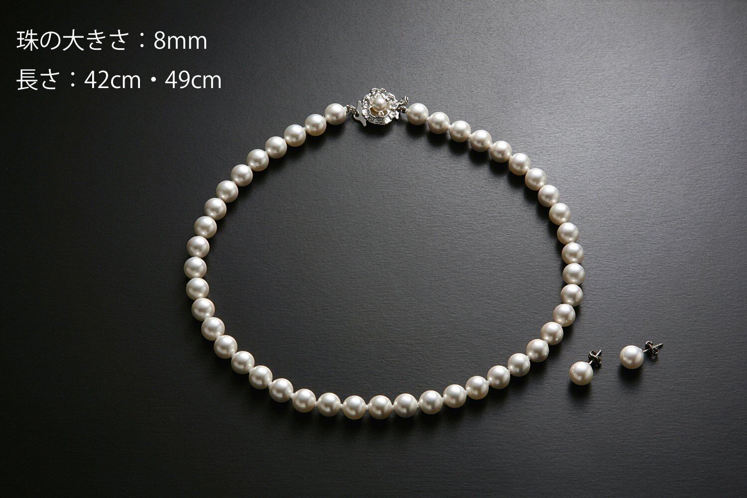 ネックレスの長さは42cmと49cmからお選びいただけます。珠の大きさは8mmです。