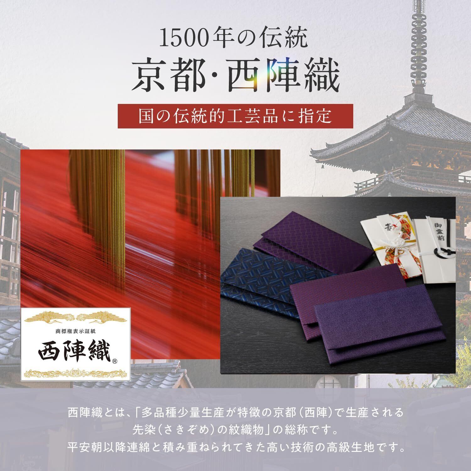 (西陣織 正絹 高級ふくさ) 伝統が息づく格式あるふくさ 京都・西陣で織り上げた正絹の西陣織を使用。(証紙付) 絹ならではの上品な艶と繊細な織柄が、結婚式や葬式など格式を重んじる場面にふさわしい品格を演出します。