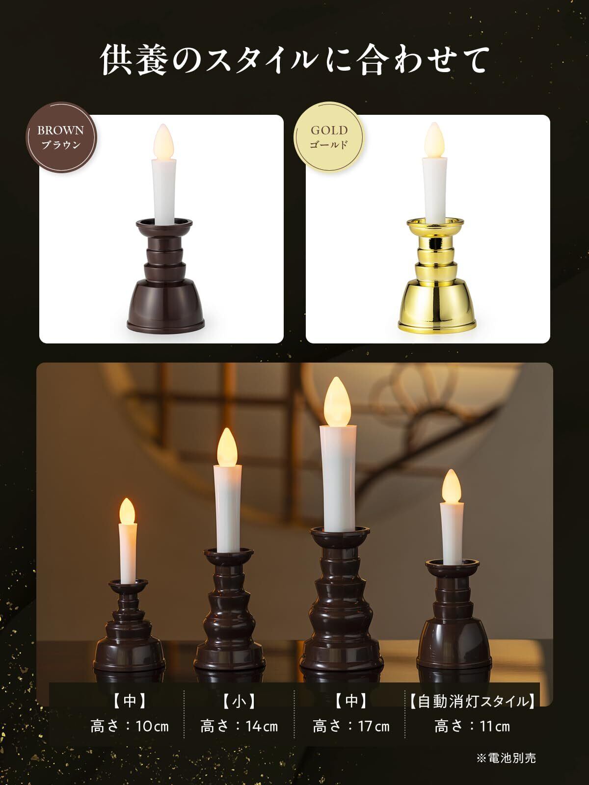 (選べるカラー・サイズ・点灯時間) ブラウンとゴールドの2色展開。サイズは、ミニ(高さ約10cm・約60時間点灯)、小(高さ約14cm・約70時間)、中(高さ約17cm・約160時間)、自動消灯タイプ(高さ約11cm・約7分で自動オフ)の4種類をご用意。用途や設置場所に合わせて選べます。
