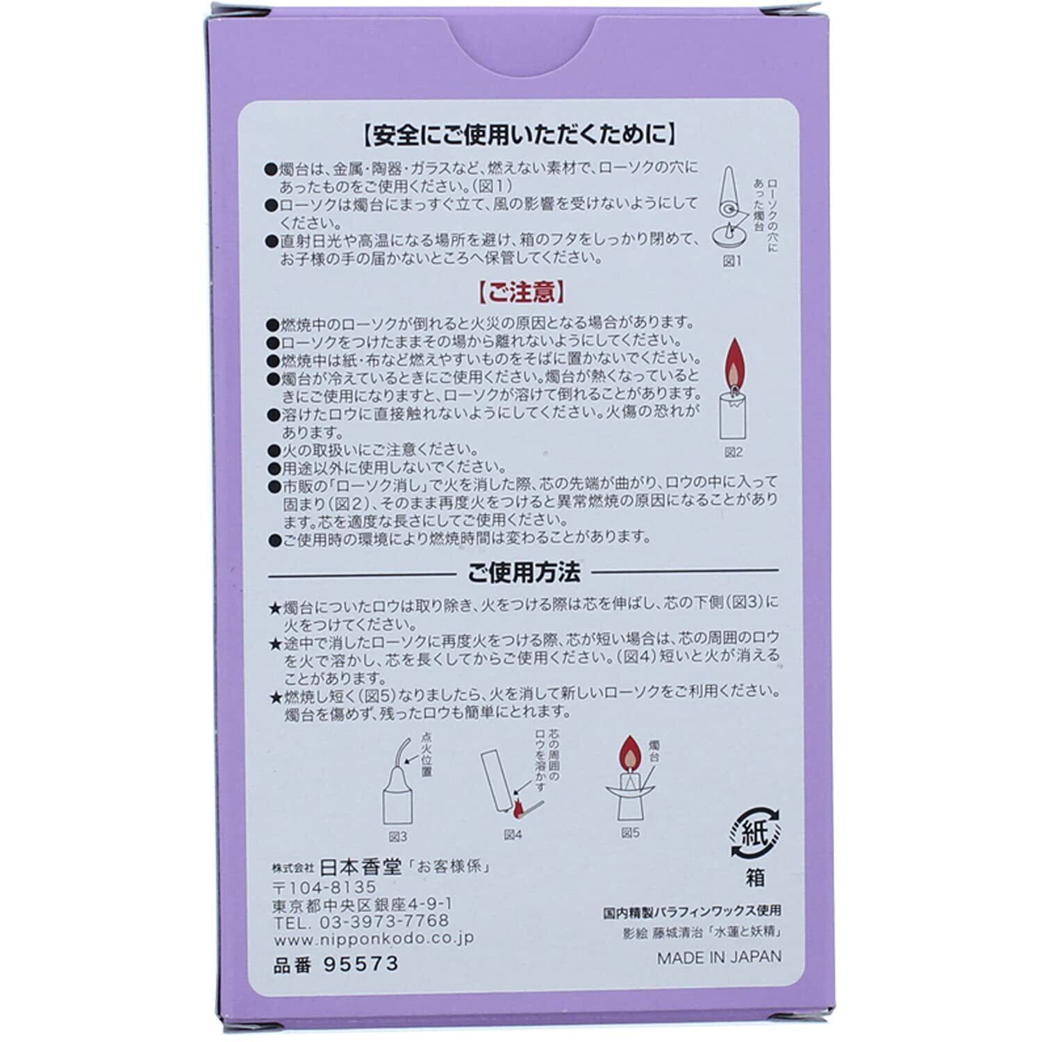 蝋台を金属・陶器・ガラスなど、燃えない素材で、ローソクの穴にあったものをご使用ください。 ローソクは蝋台にまっすぐ立て、風の影響を受けないようにしてください。 直射日光や高温になる場所を避け、箱のフタをしっかり閉めて、お子様の手の届かないところへ保管してください。 燃焼中のローソクが倒れると火災の原因となる場合があります。 ローソクをつけたままその場から離れないようにしてください。 燃焼中は紙・布など燃えやすいものをそばに置かないでください。 蝋台が冷えているときにご使用ください。蝋台が熱くなっているときにご使用になりますと、ローソクが溶けて倒れることがあります。 溶けたロウに直接触れないようにしてください。火傷の恐れがあります。 火の取扱いにご注意ください。 用途以外に使用しないでください。 市販の「ローソク消し」で火を消した際、芯の先端が曲がり、ロウの中に入って固まり、そのまま再度火をつけると異常燃焼の原因になることがあります。芯を適度な長さにしてご使用ください。 ご使用時の環境により燃焼時間は変わることがあります。