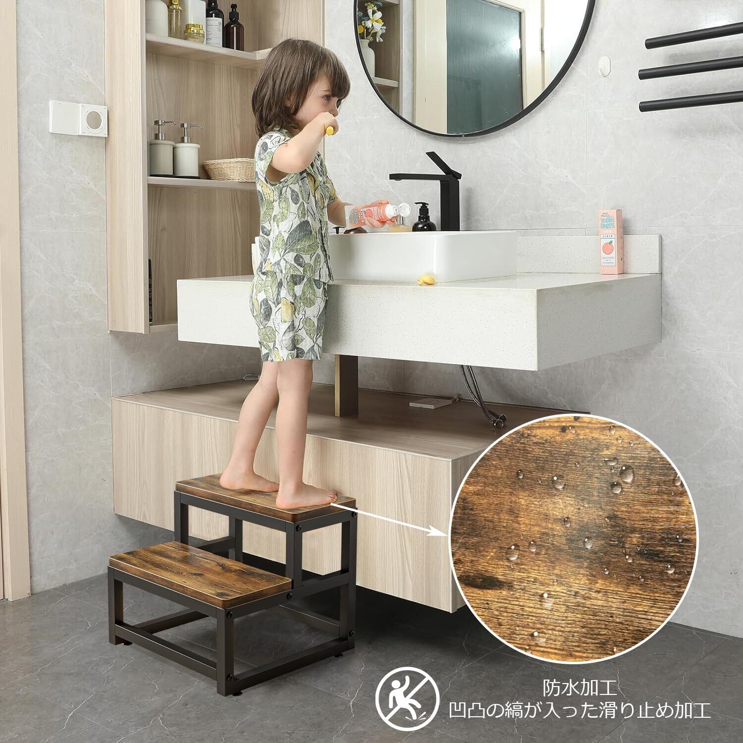 滑り止め付きステップ台: 凹凸の縞が入った滑り止め加工で、靴下のままでも安心して使用可能です。軽量で便利に移動でき、すべての脚の底には滑り止めマットが付いており、床を傷つける心配がありません。木製ステップスツールは大人向けに、子供用で、歯磨きや手を洗う時の高さを補います。防水加工済みで、濡れた布で簡単に掃除できます。
