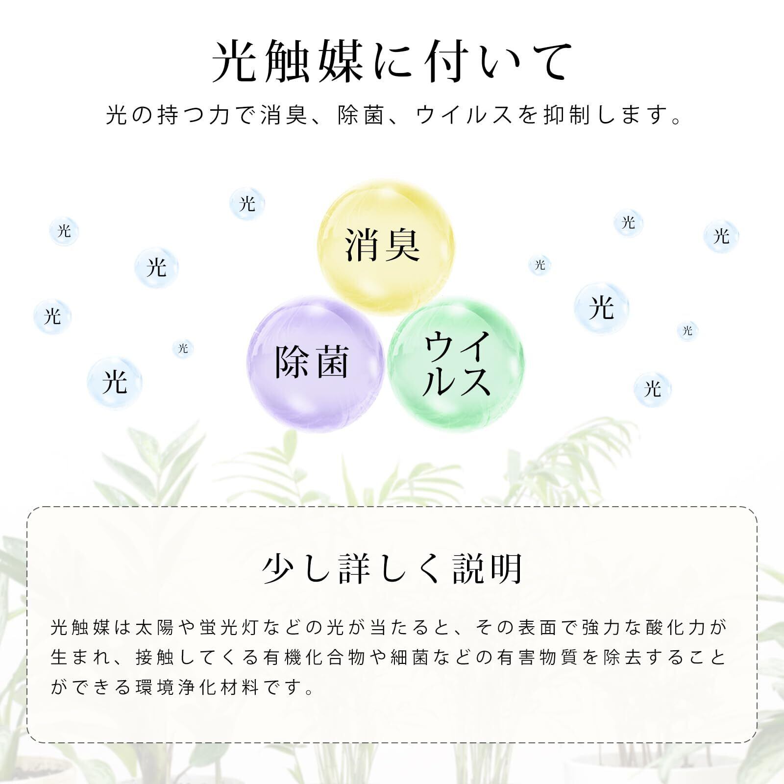 【光触媒加工】人工観葉植物は光触媒を加工していますので、光を当てると、化学反応が発生できます。観葉植物表面の細菌などの有害物質を除去して耐用性も長いし、エコです。化学産物はCO₂、H₂Oなどの無害物であり、多くのシーンに活躍で抗菌防臭性能も高いです。
