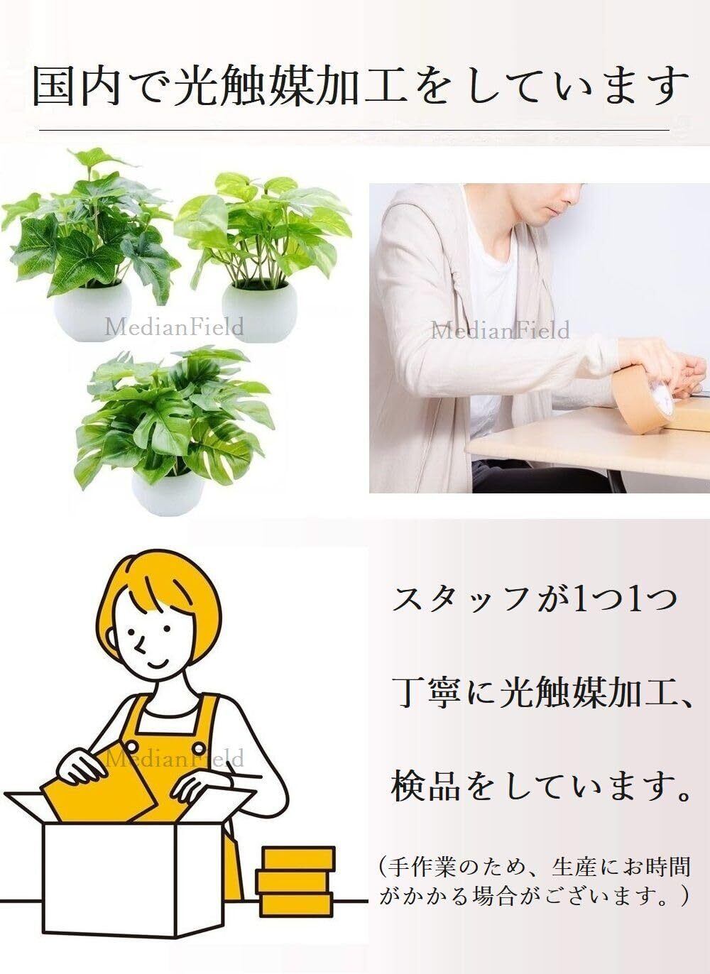 【国内で光触媒加工】当店は国内で1つ1つ丁寧に光触媒加工、検品を行っております。光触媒は二酸化チタンが主原料なので、食品や化粧品の添加物にも使用されており、赤ちゃんや小さなお子様、ペット、お年寄りなどがいるご家庭でも安心して飾ることができます。 花粉やホルムアルデヒドなどにも有効なので、花粉症対策やシックハウス症候群にも効果的です。お見舞いやプレゼントなどにもおすすめです。 光触媒は光のエネルギーを利用しておりますので電気代がかからず、ランニングコストが不要です。