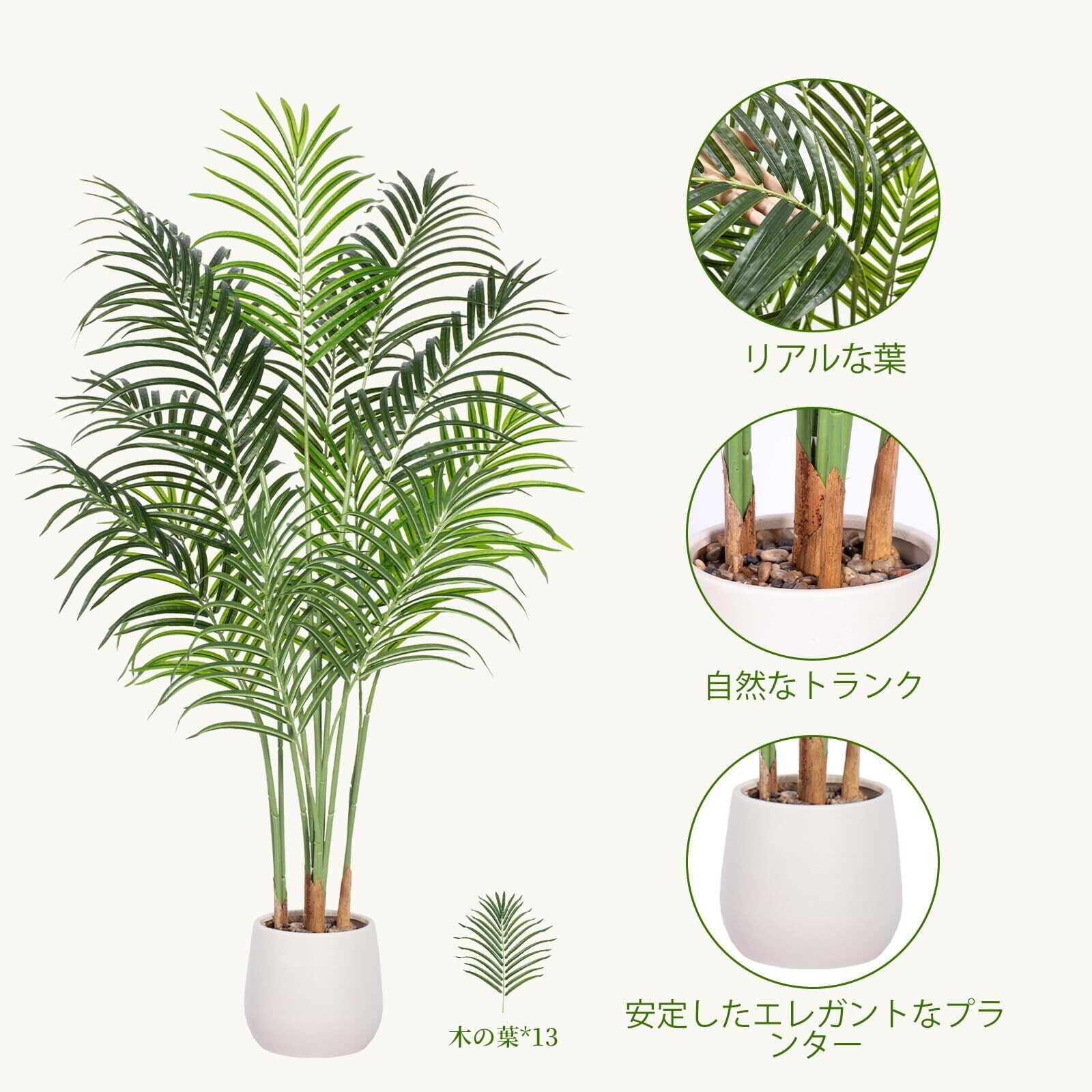 Keeplush 120cm 大型フェイクアレカヤシの木 、南国リゾート気分を日常に!リビング、寝室、オフィス、エントランスなど、どんな空間も一気に明るくおしゃれに変える大型人工観葉植物です。13枚のリアルな葉と本物の木の皮で包まれた枝が、フェイクとは思えない本物そっくりの質感を再現。光触媒加工でほこりが付きにくく、インテリアに自然の癒しをプラスします。 精巧に作られた葉と幹は見た目も触り心地も本物の観葉植物のようで、おしゃれな白ポット付きなのでそのまま飾っても映える大型フェイクグリーン。水やり不要で日光が当たらない場所でも鮮やかな緑をキープするので、忙しい方にもぴったりの人工植物観葉植物です。 リビングのアクセントやオフィスのグリーンリラックススペース、エントランスのウェルカムプラントとして最適なこの造花は、枯れる心配なしでいつでも新鮮な南国ムードをお楽しみいただけます。フェイクならではの手間いらずな大型観葉植物で、上質な緑の空間を手軽に実現しましょう。