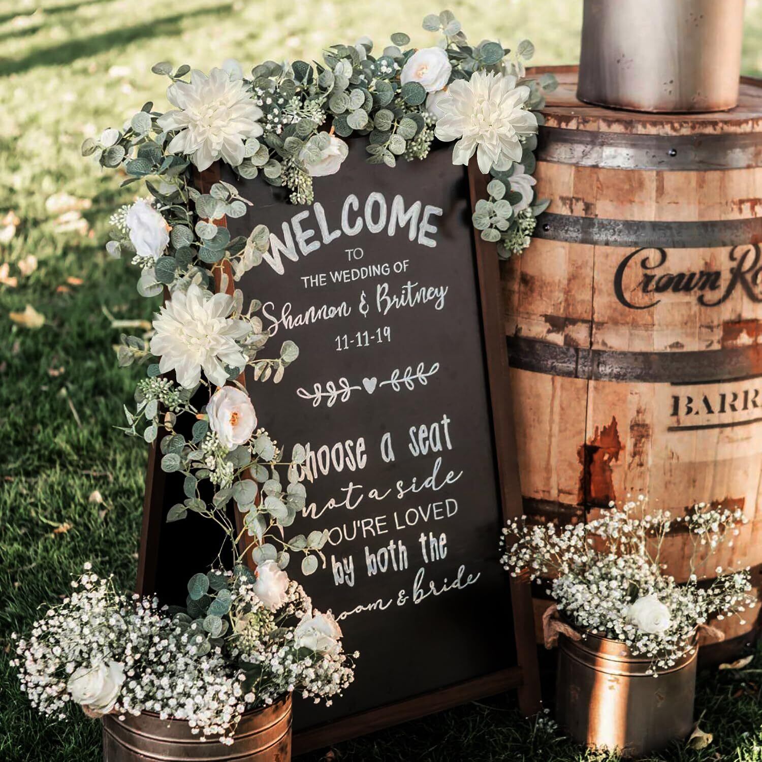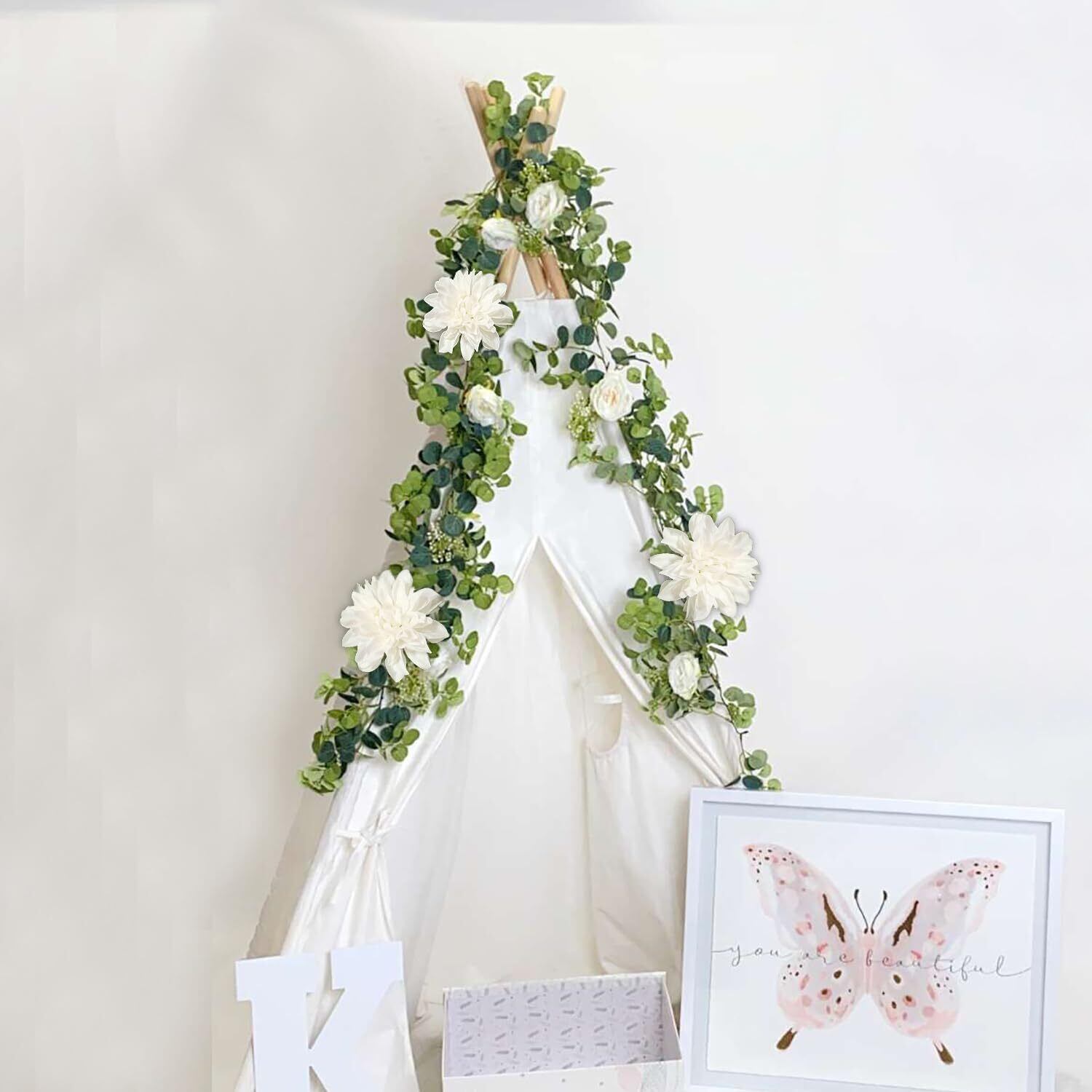 造花のつる1個がパッケージに入っています。 白ダリア3個、白椿6個、ユーカリの葉